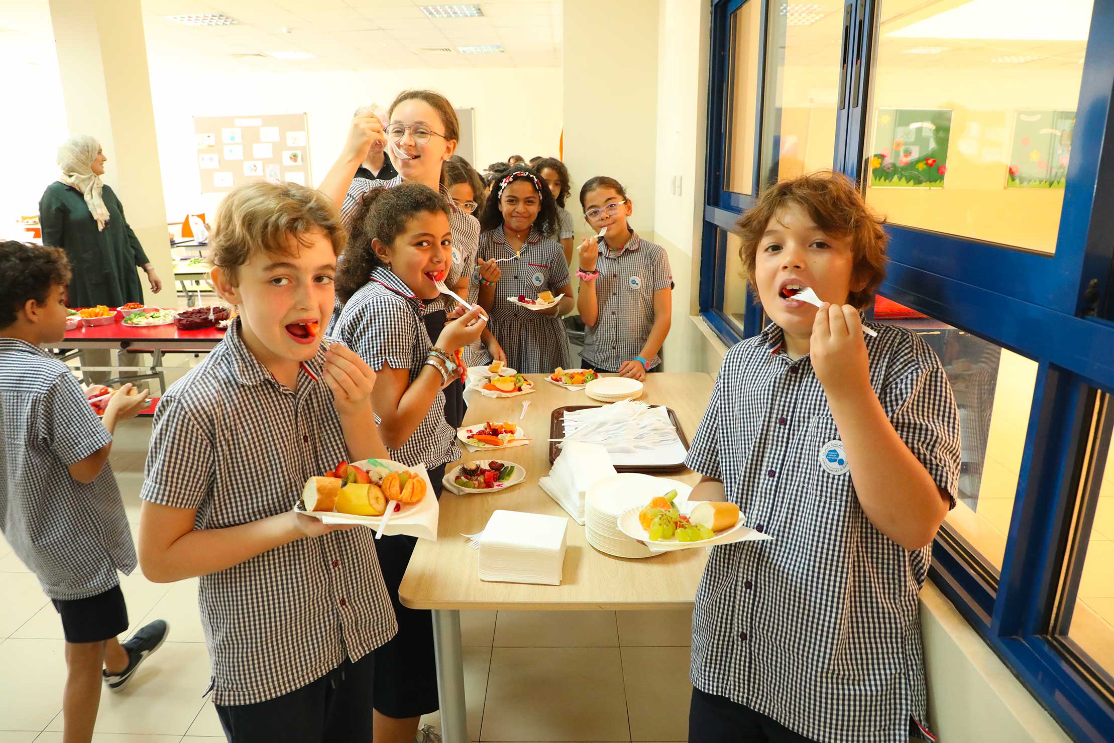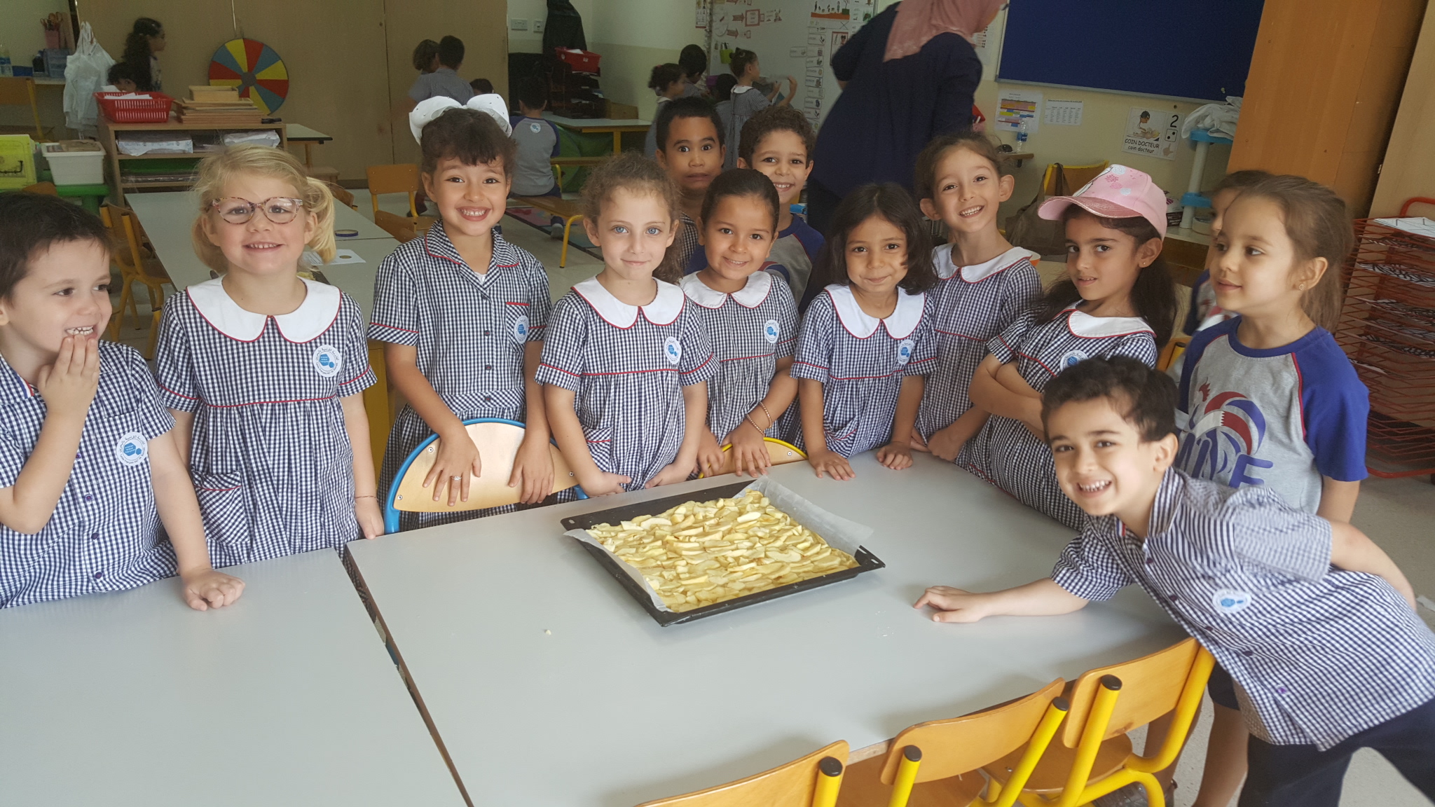 Pendant ce temps, les CP en profitent pour faire une bonne dégustation : Chaque matin, des spécialités sucrées et salées sont apportées par des parents d’élèves.
