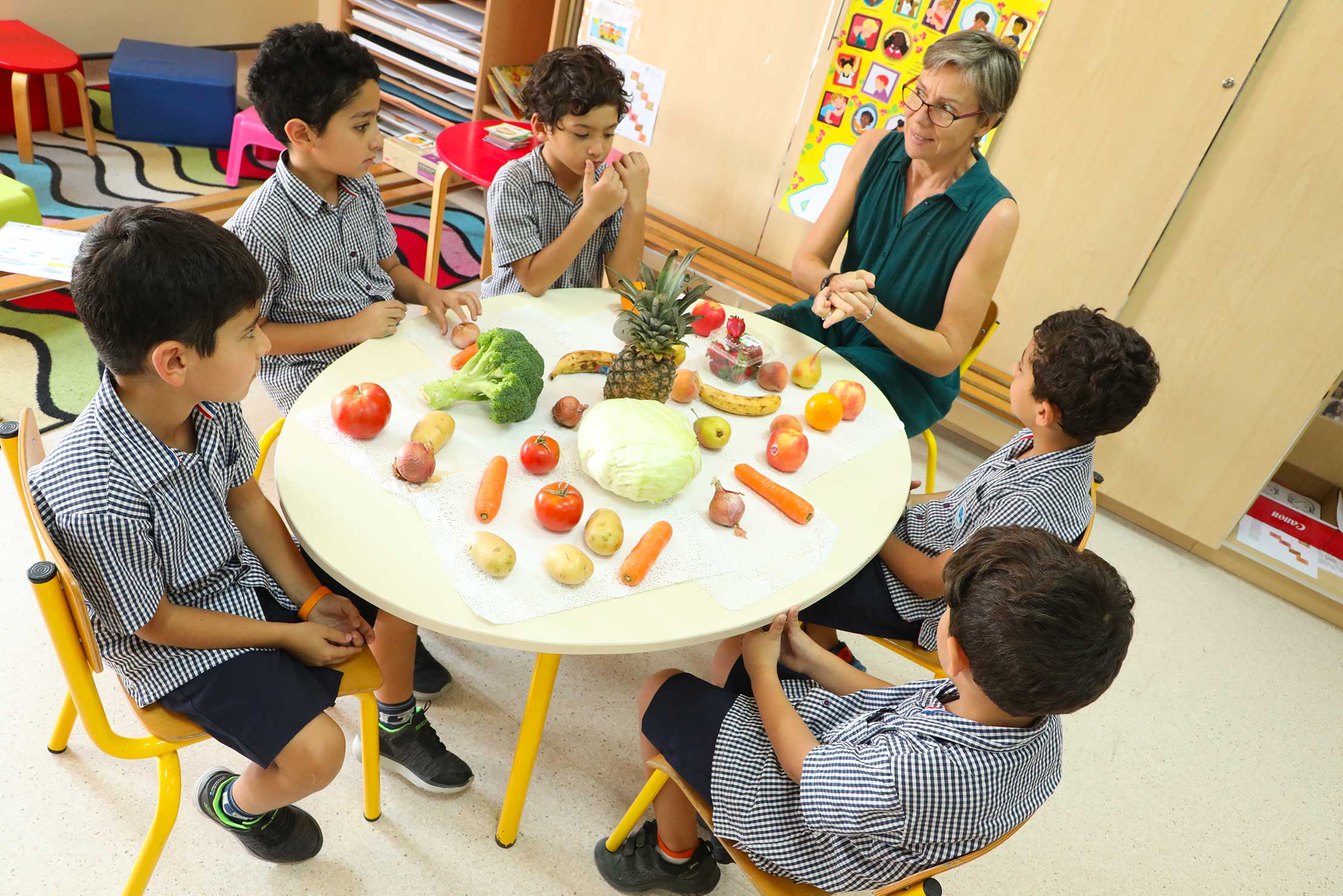 Accompagnés de leur professeur Véronique Seguinot, les élèves de CP en cours de FLE (Français Langue Étrangère) vont pouvoir réviser le vocabulaire des fruits et des légumes !