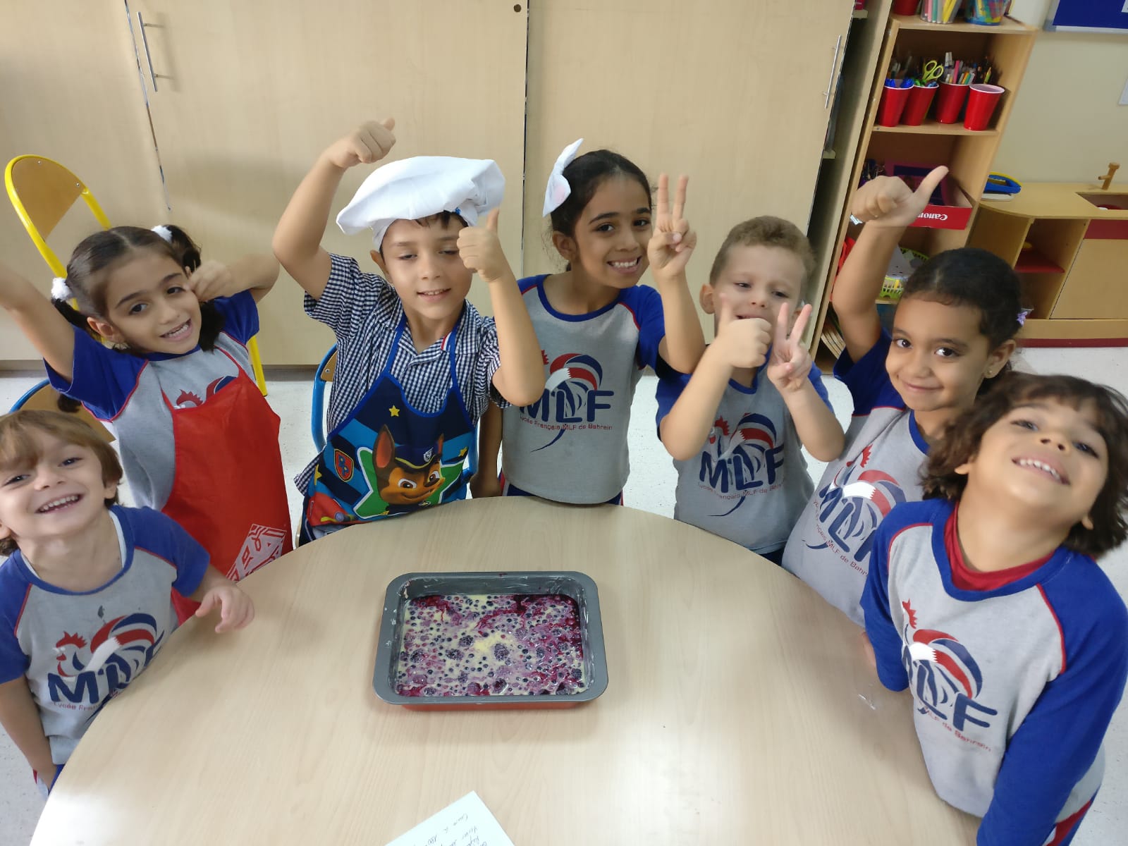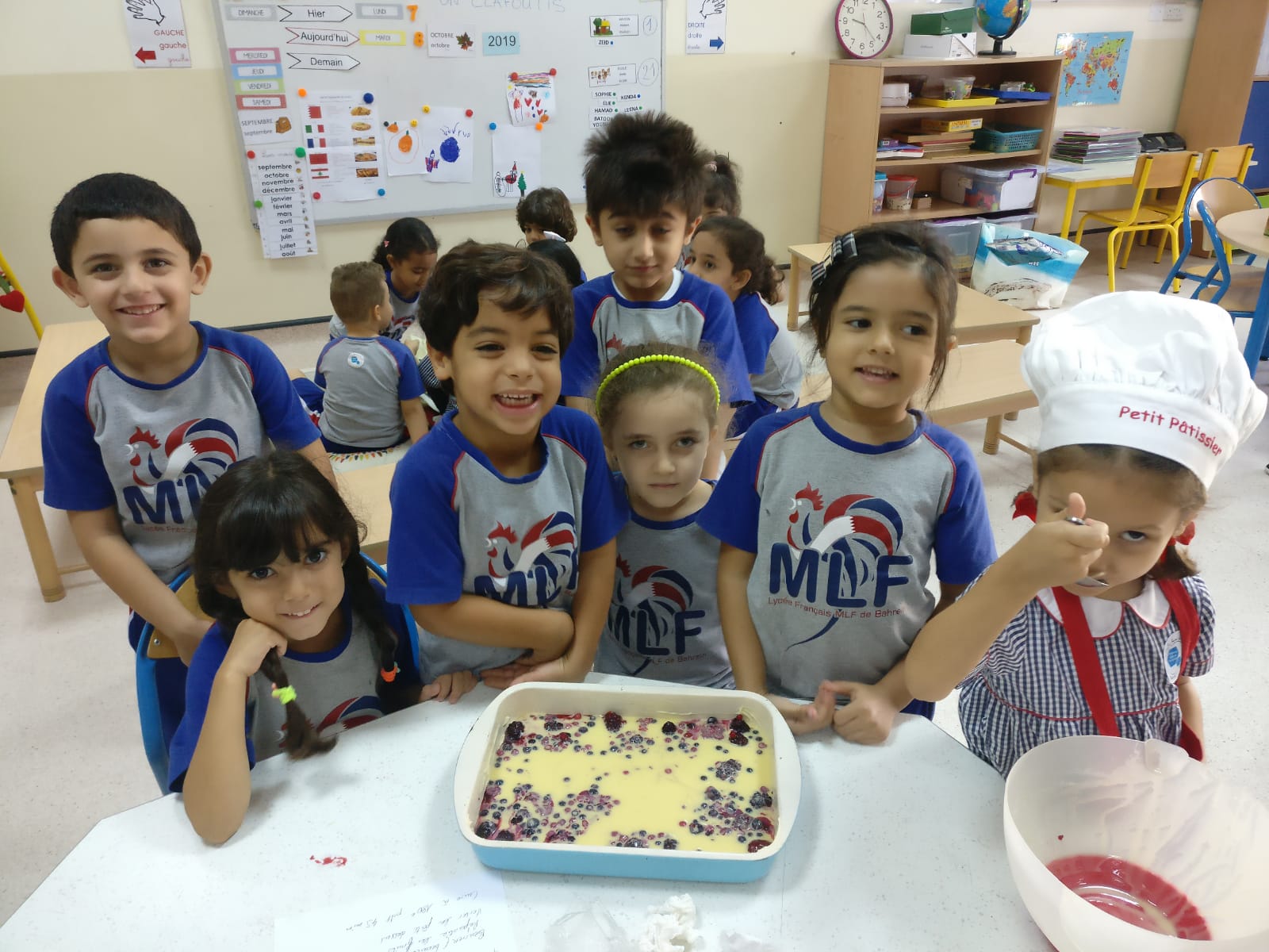 Chez les petits, il est temps pour les GS de se mettre a la pâtisserie : clafoutis aux fruits rouges pour les GSA et tartes aux pommes pour les GSB. Ils se réunissent ensuite pour un goûter commun en fin de journée !