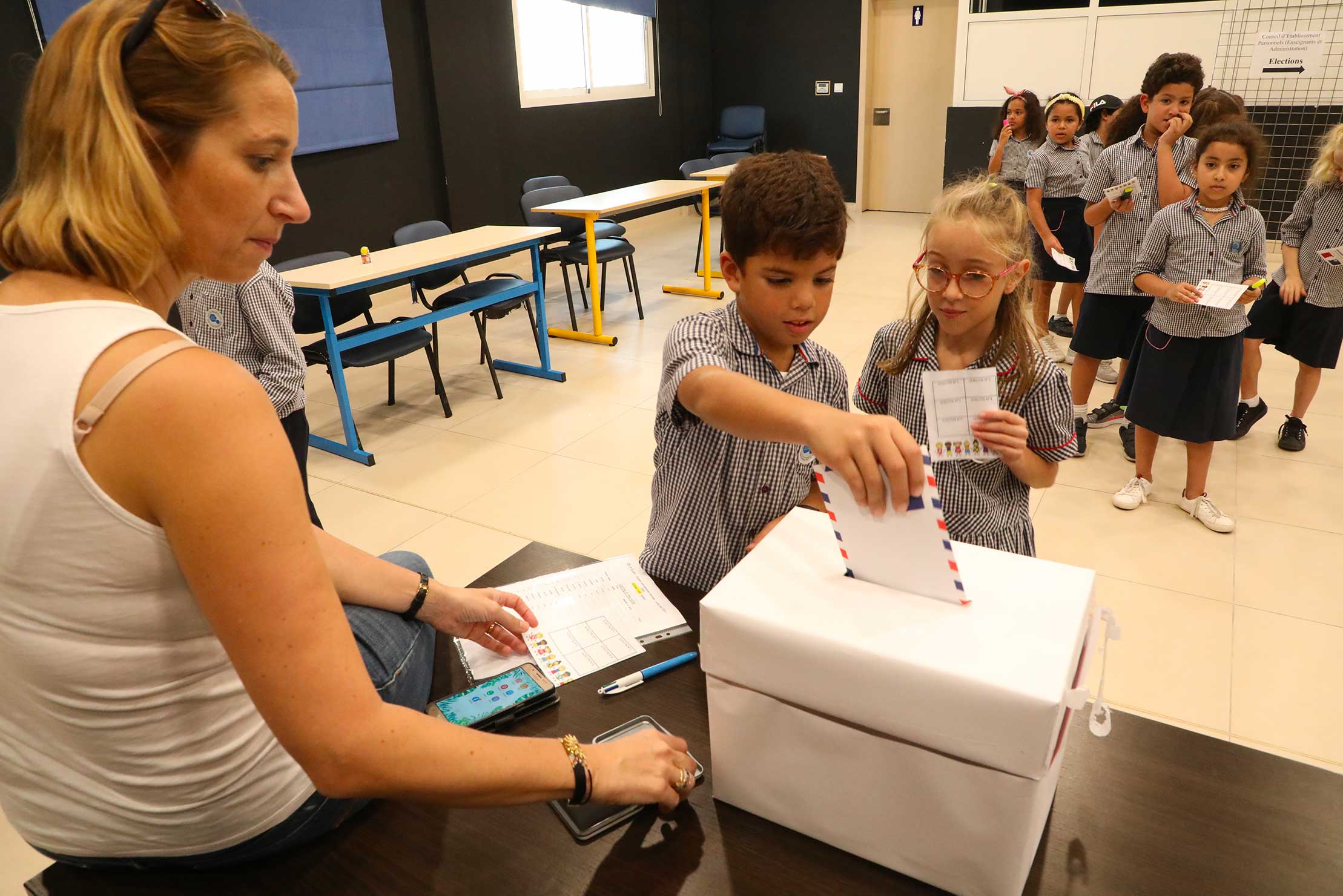 Après les élections des représentants des parents d’élèves et des professeurs, les classes de CE2 ont profité de l’installation du bureau de vote à l’auditorium pour procéder à leurs propres élections.