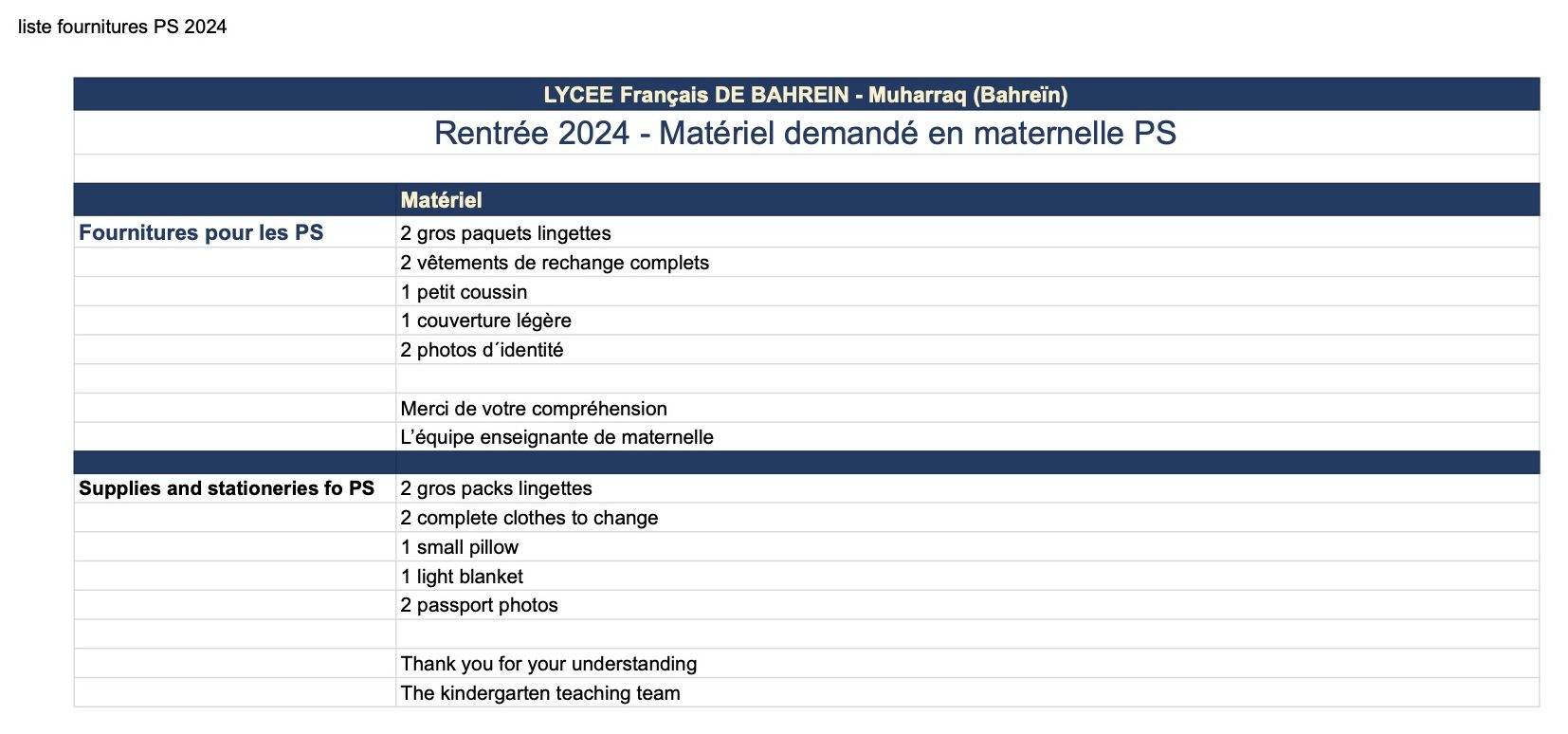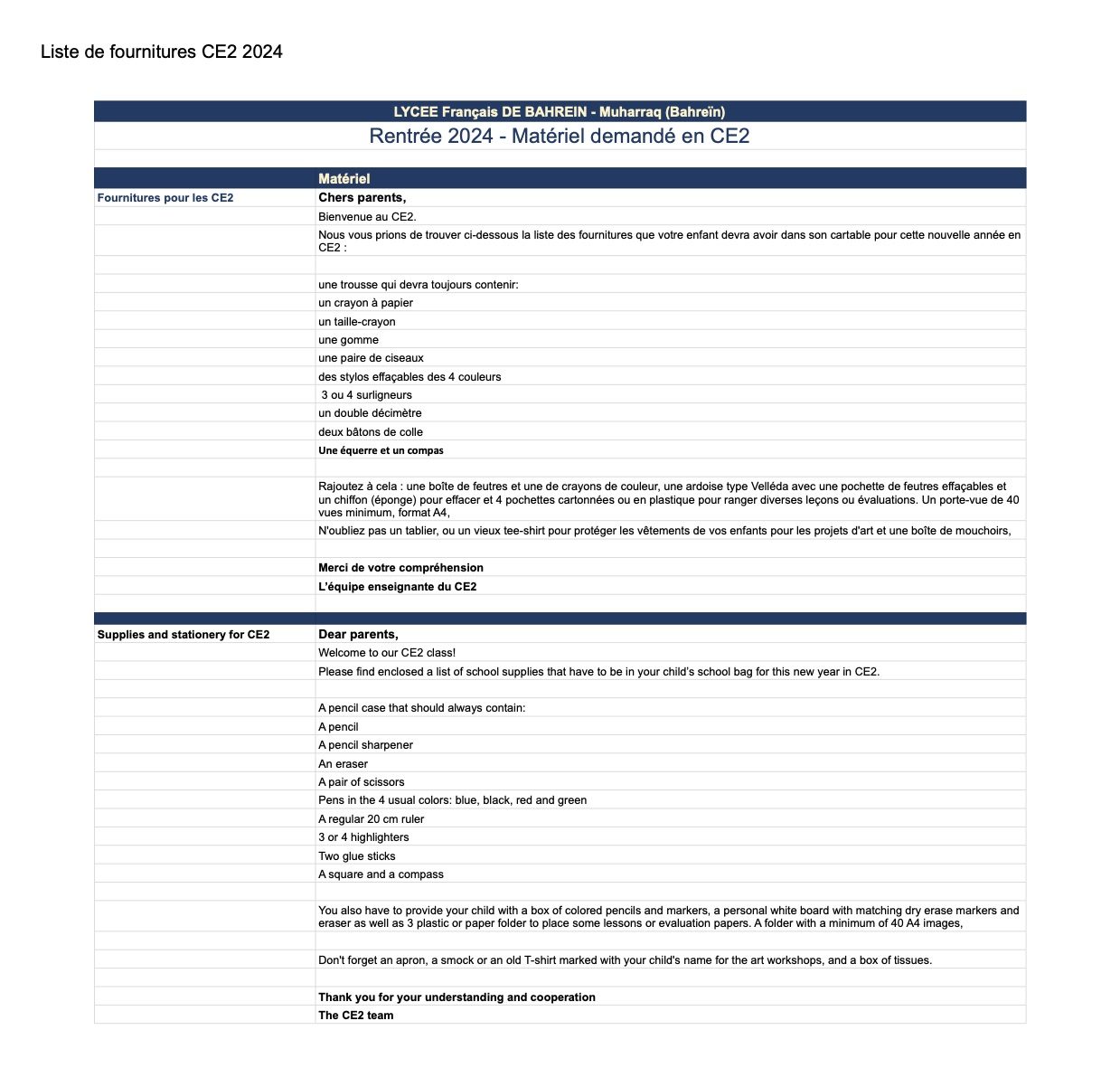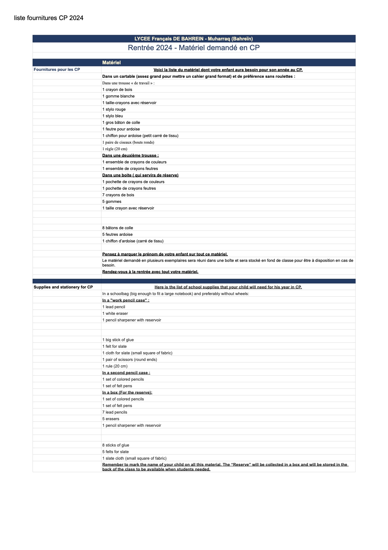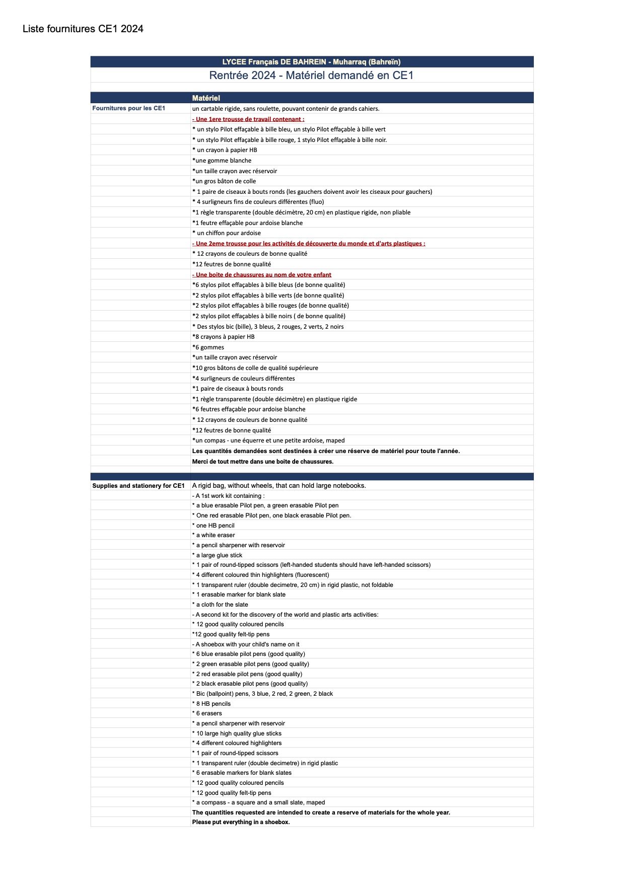 Fournitures scolaires 2024-2025 By Communication LFIB Actualités Primaire,Boîte à la Une, 24Juin, 2024 Veuillez trouver, ci-joint, les listes des fournitures scolaires pour l’année 2024 – 2025 Partager :TweetPlusJ’aime ça :J’aime chargement… Previous Calendrier 2024-2025 mai 8, 2024 Next Baccalauréat 2024 juillet 1, 2024