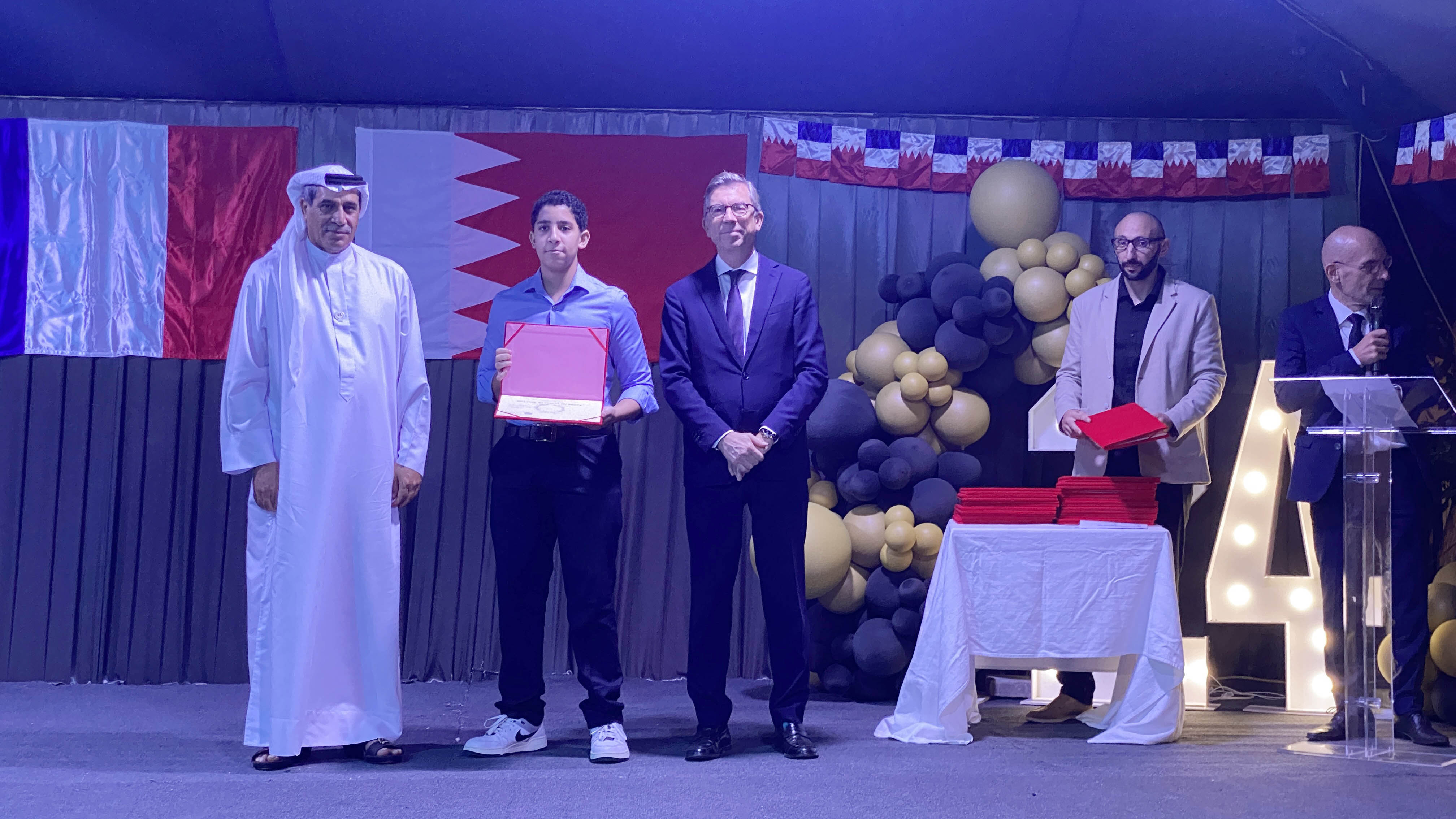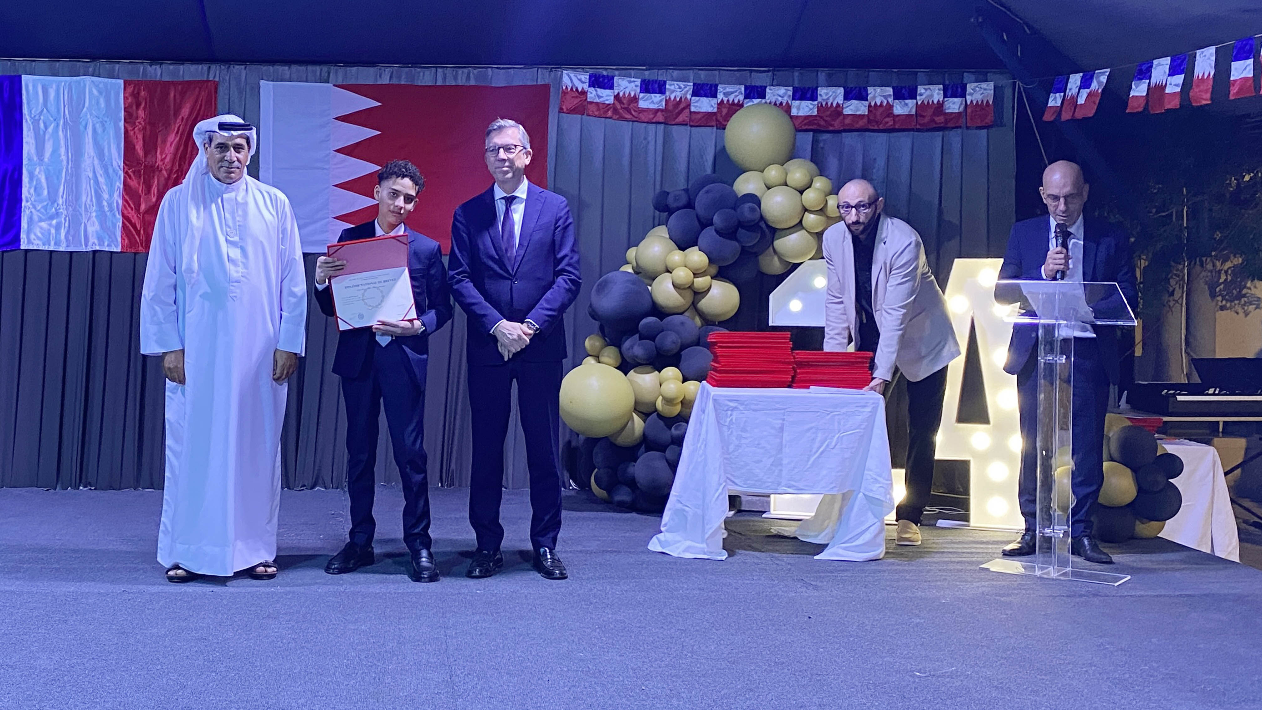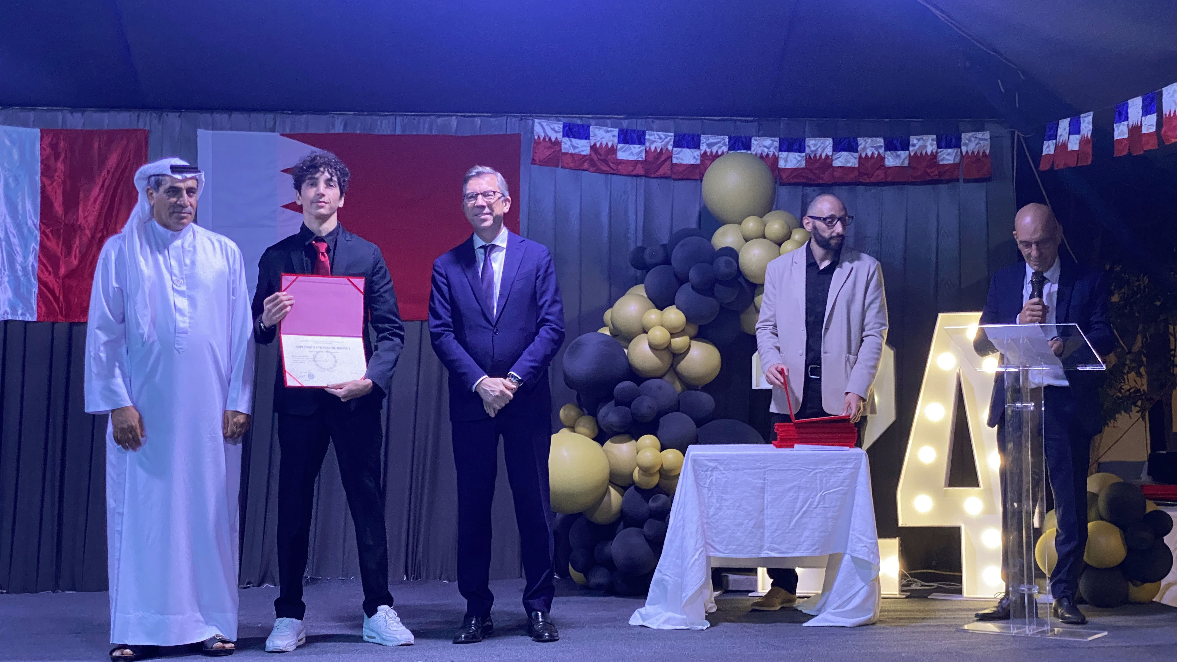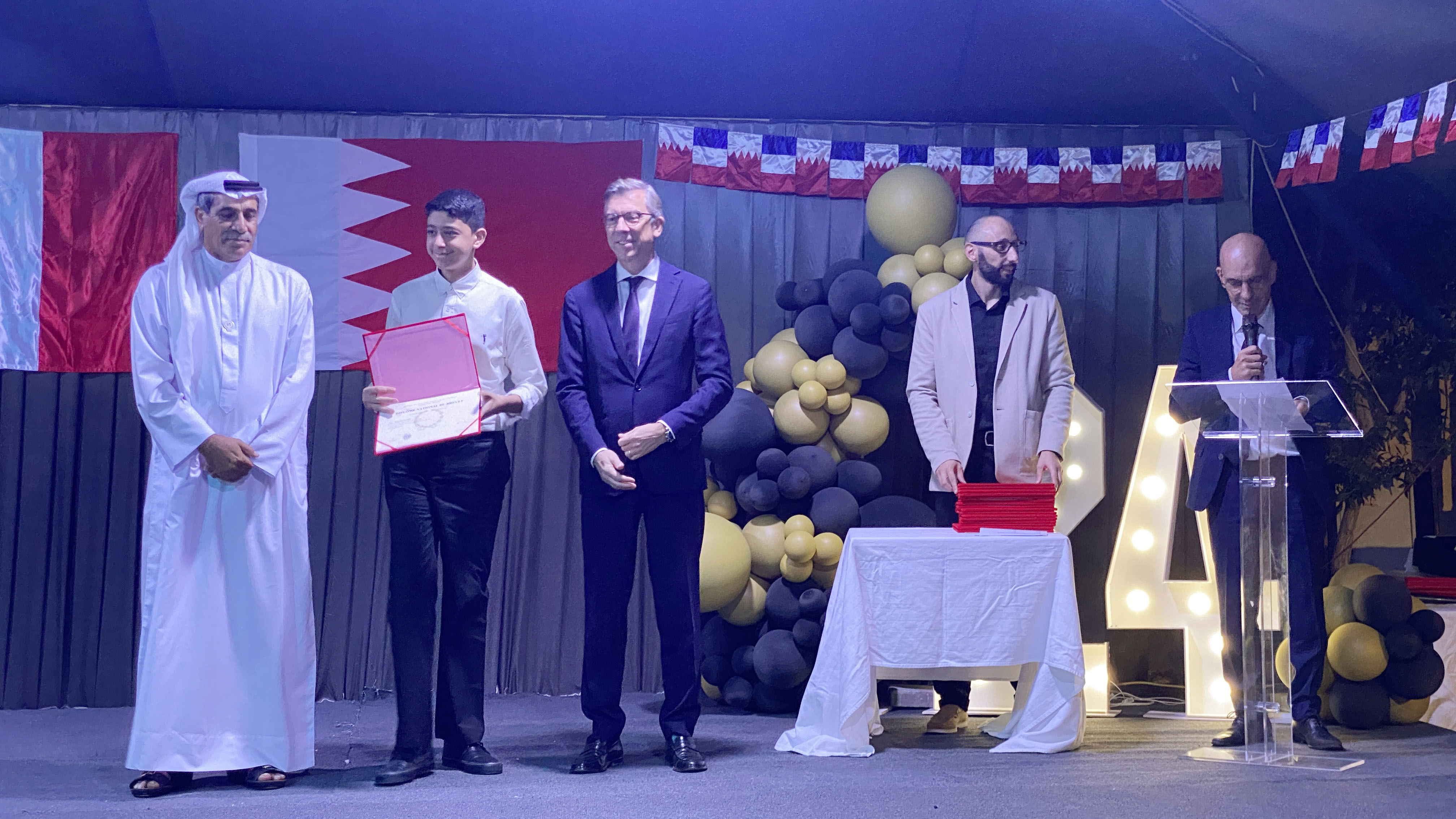 Une soirée mémorable s’est déroulée hier soir au Lycée Français International de Bahreïn. À l’occasion de la cérémonie de remise des diplômes du DNB, nous avons eu l’honneur d’accueillir Son Excellence l’ambassadeur de France à Bahreïn, M. Eric Giraud-Telme , le vice-gouverneur général, M. Jassim Mohamed Alghatam, et le directeur du département des programmes sociaux et des affaires communautaires, Ingénieur Mohammed Aljowder.