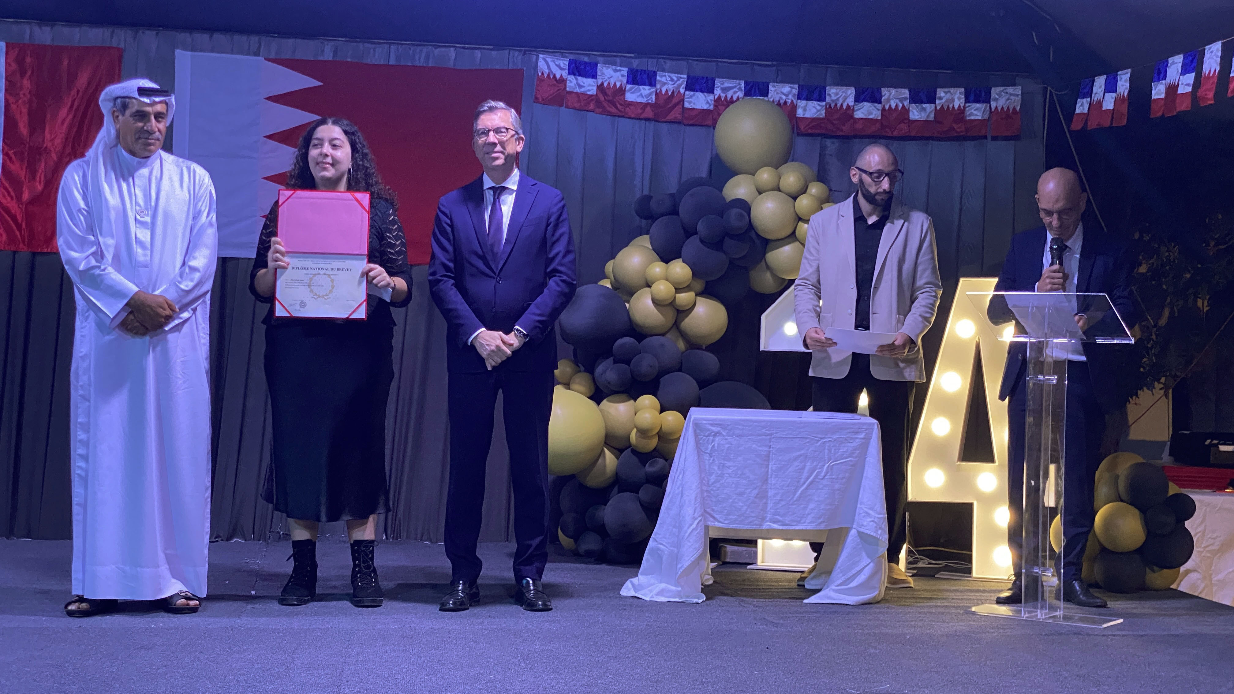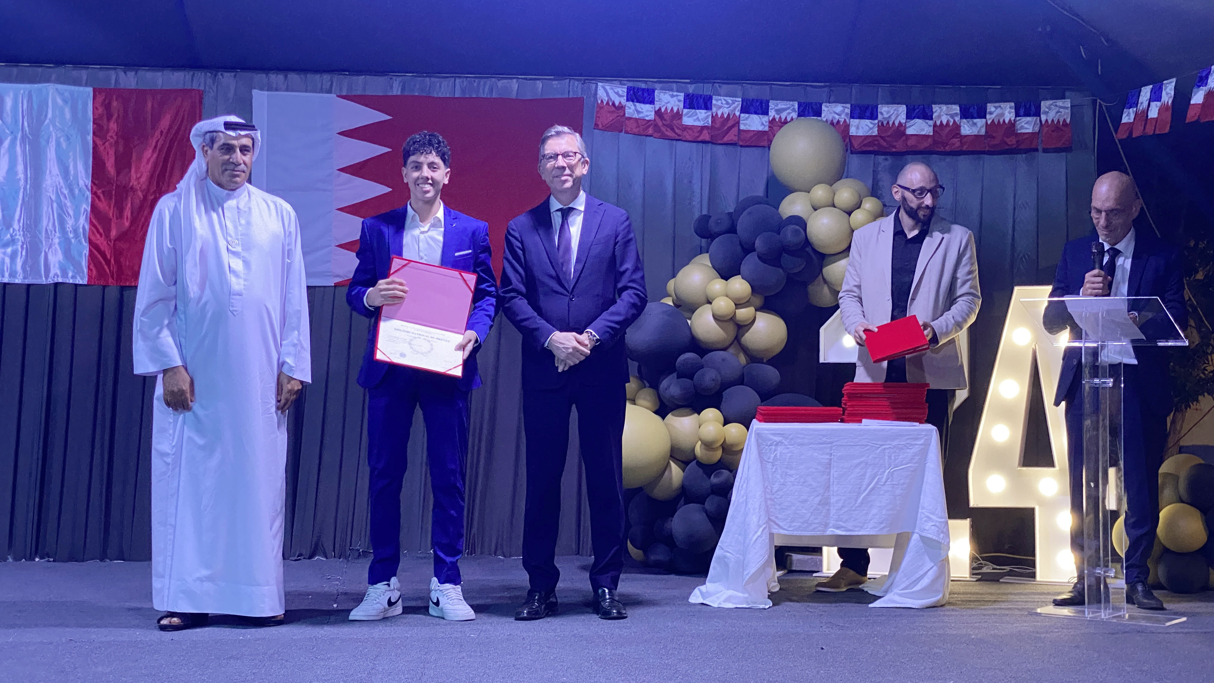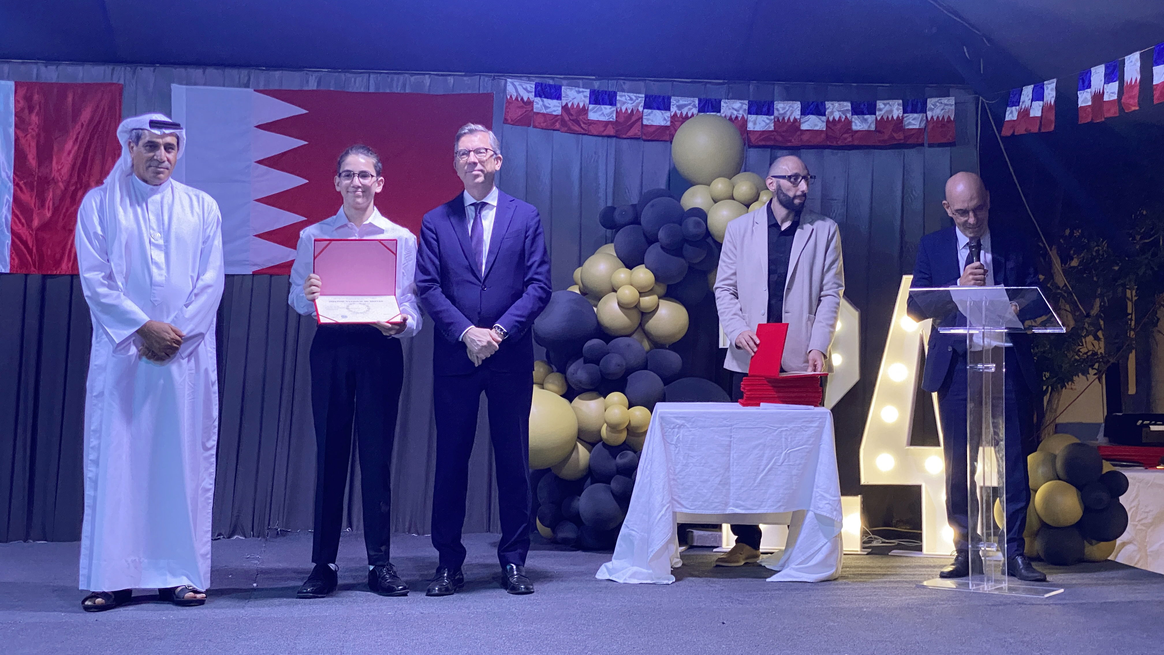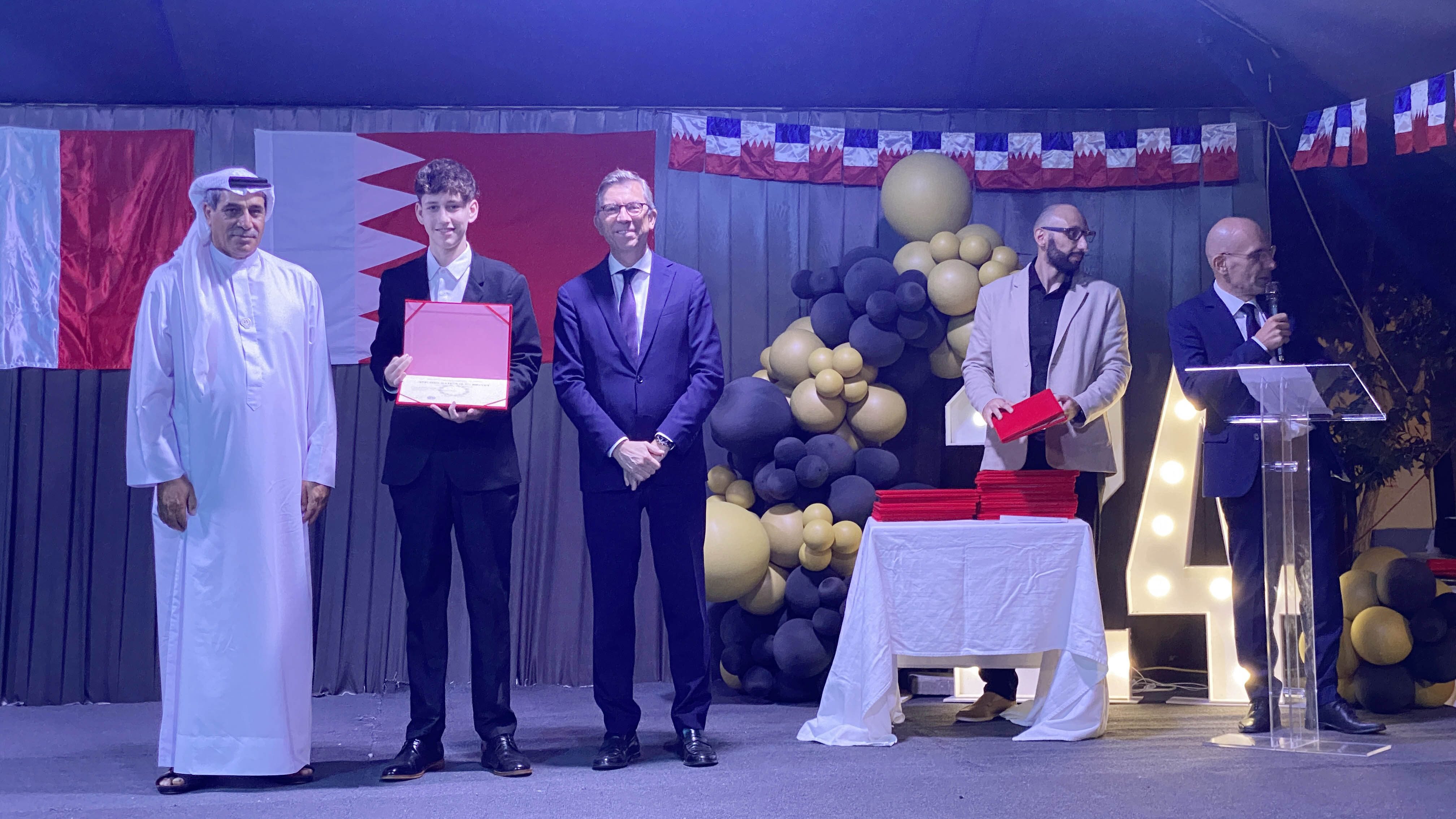 Une soirée mémorable s’est déroulée hier soir au Lycée Français International de Bahreïn. À l’occasion de la cérémonie de remise des diplômes du DNB, nous avons eu l’honneur d’accueillir Son Excellence l’ambassadeur de France à Bahreïn, M. Eric Giraud-Telme , le vice-gouverneur général, M. Jassim Mohamed Alghatam, et le directeur du département des programmes sociaux et des affaires communautaires, Ingénieur Mohammed Aljowder.
