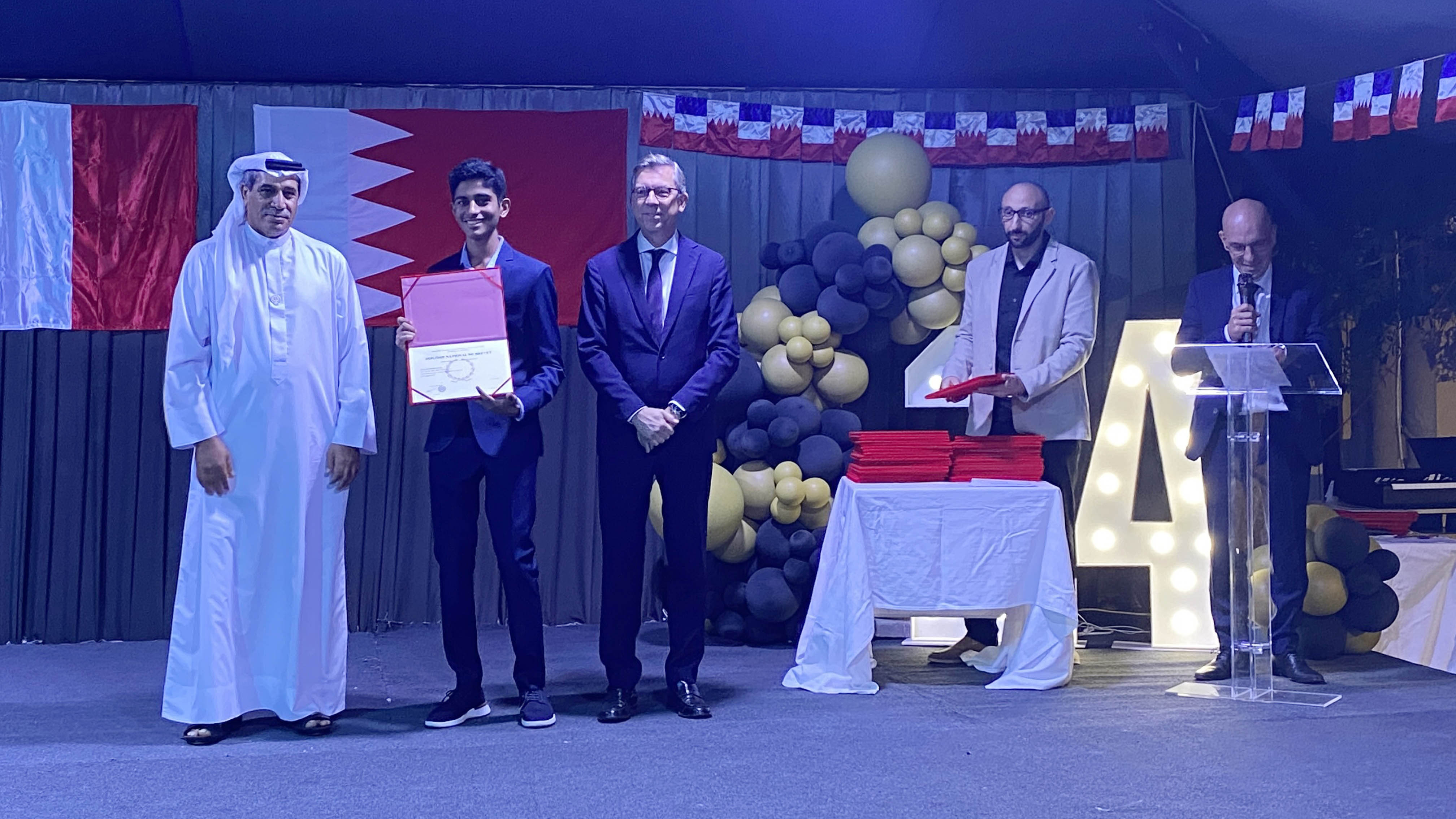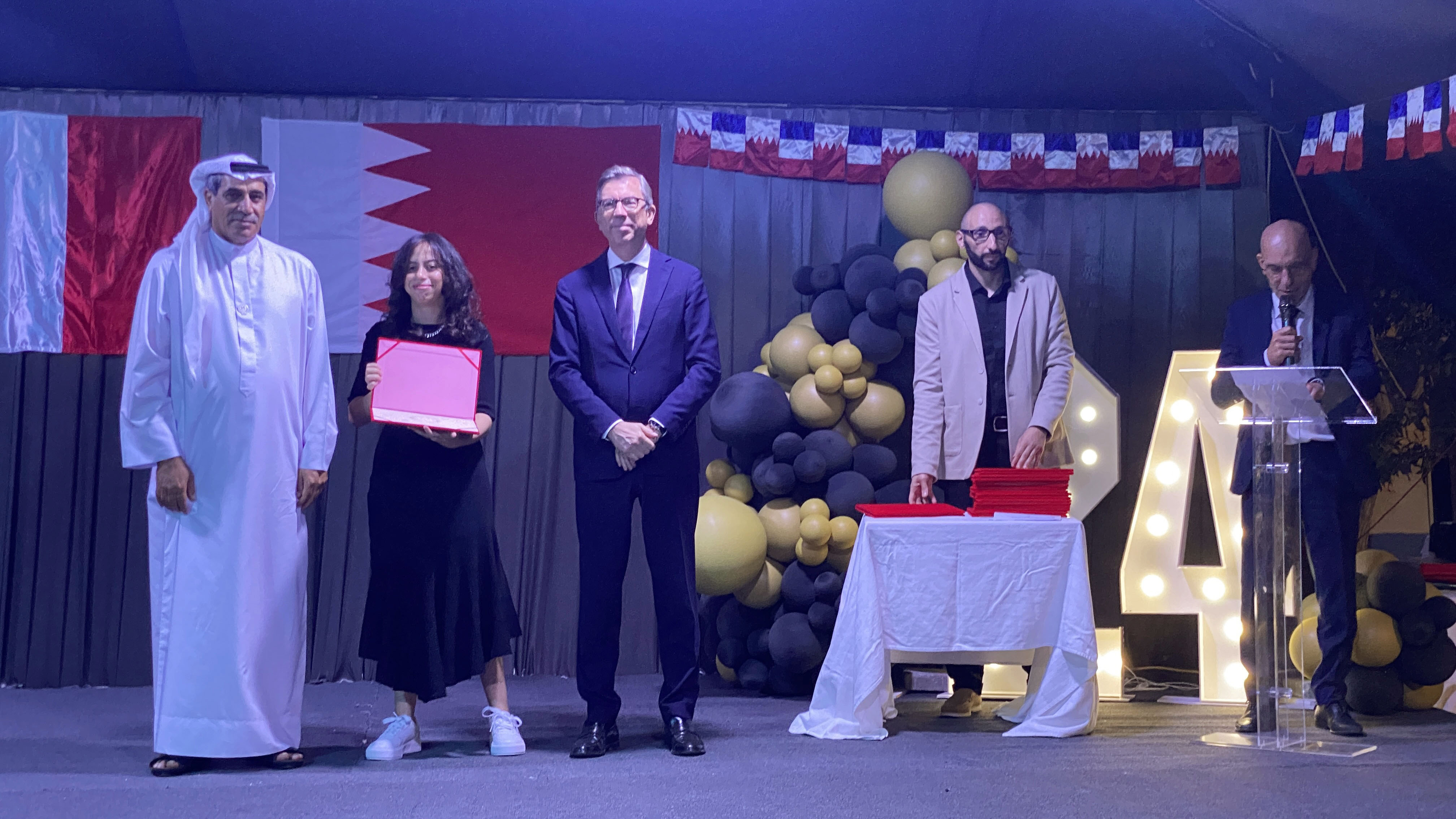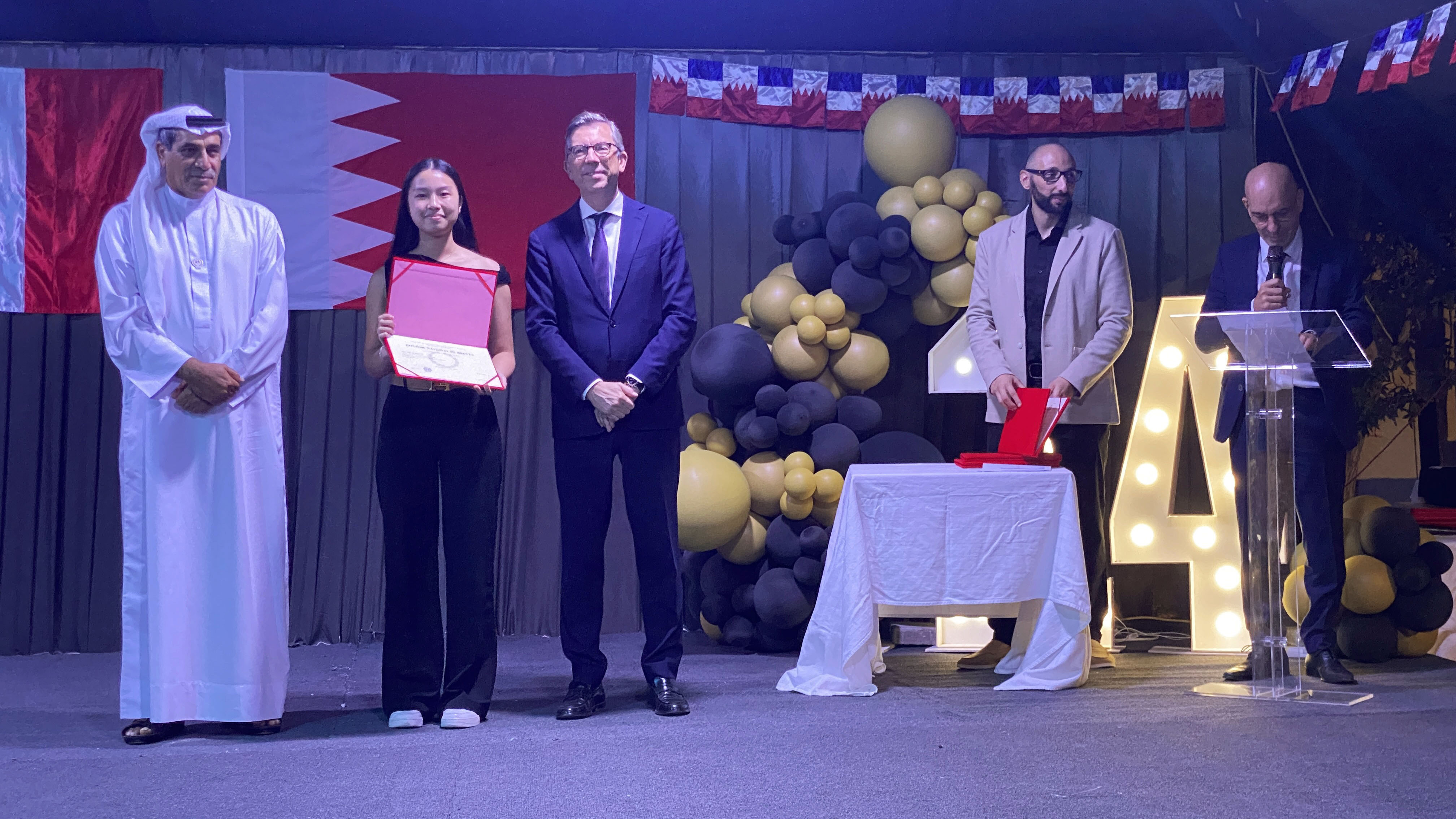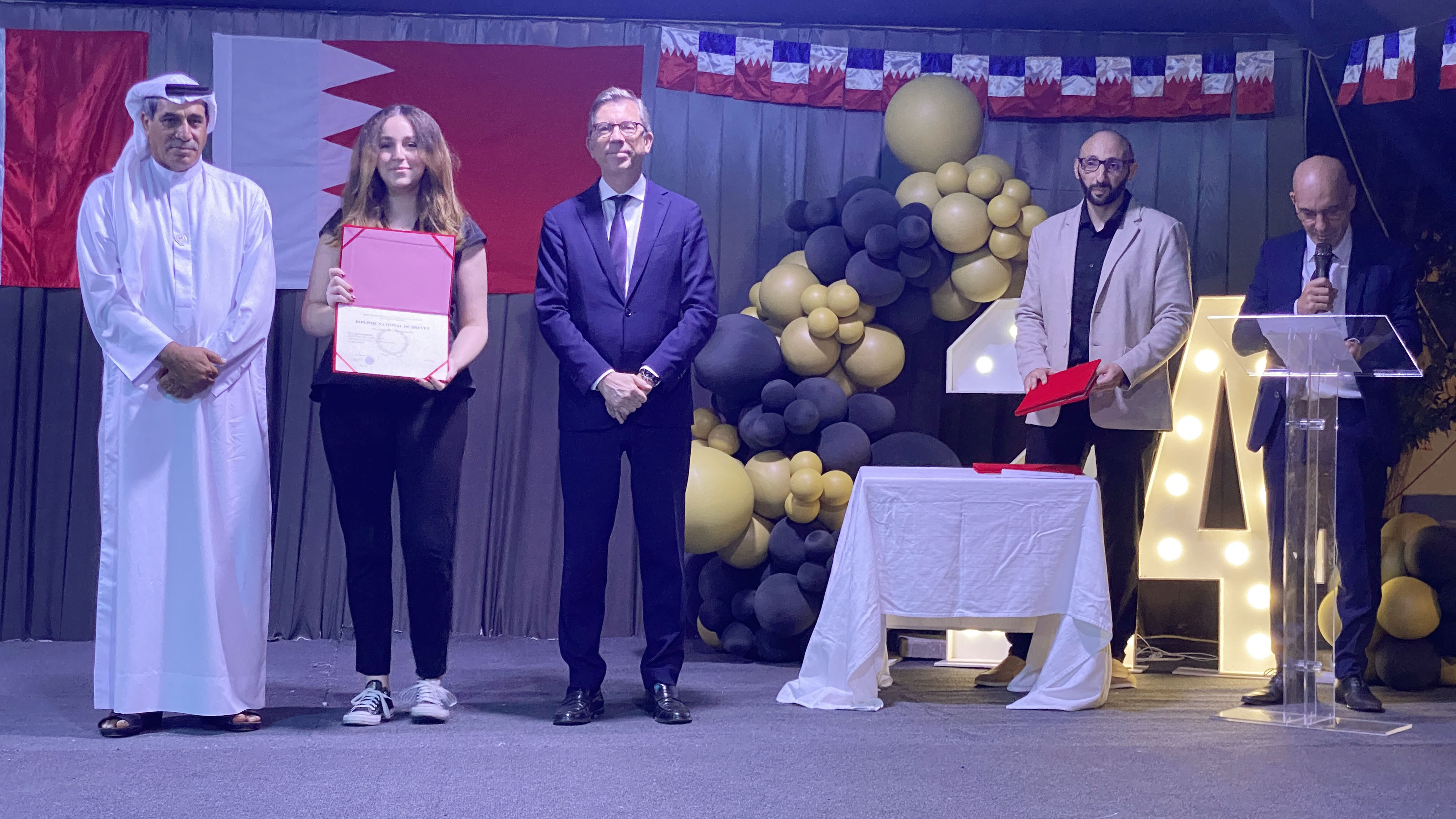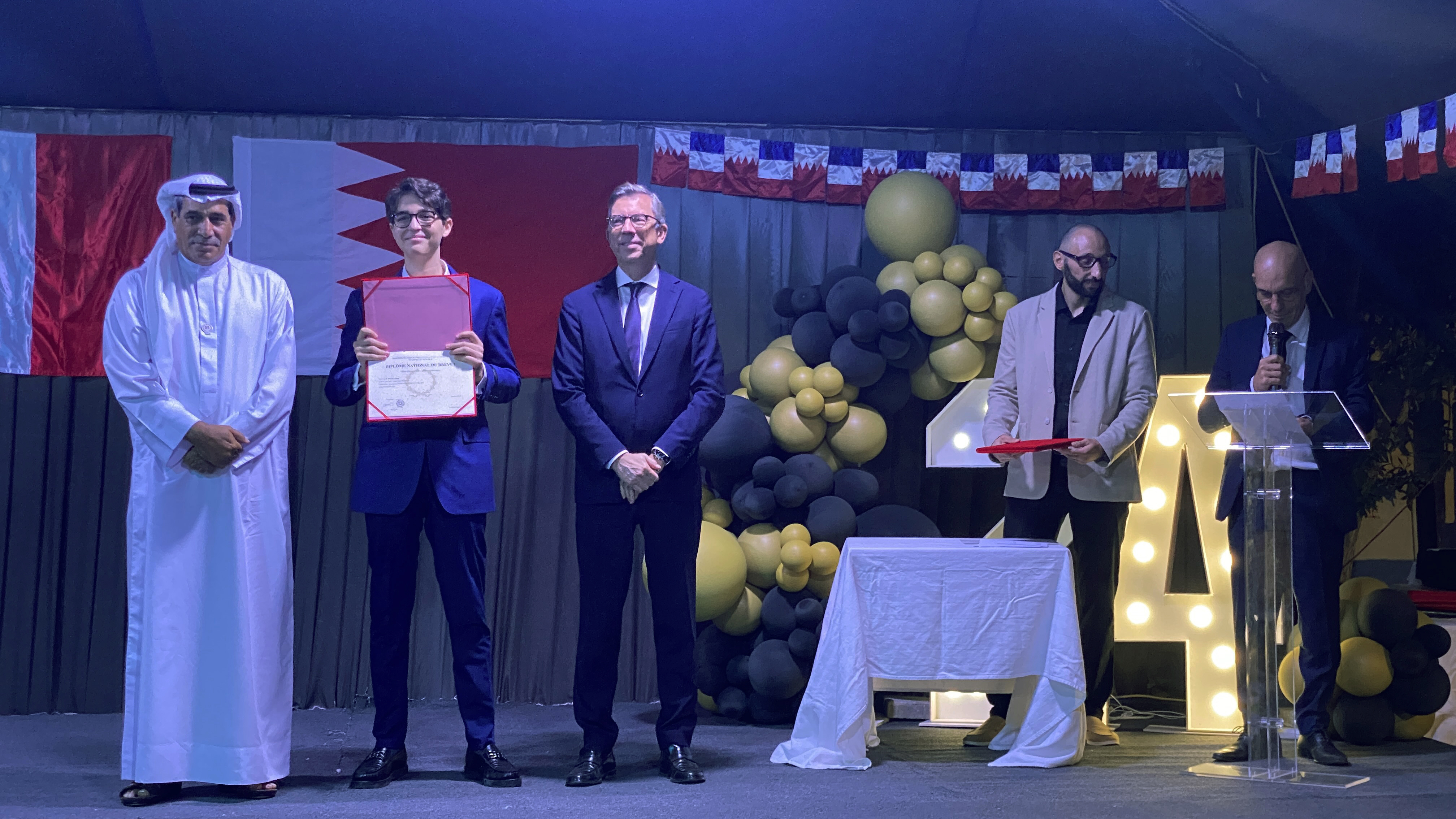 Une soirée mémorable s’est déroulée hier soir au Lycée Français International de Bahreïn. À l’occasion de la cérémonie de remise des diplômes du DNB, nous avons eu l’honneur d’accueillir Son Excellence l’ambassadeur de France à Bahreïn, M. Eric Giraud-Telme , le vice-gouverneur général, M. Jassim Mohamed Alghatam, et le directeur du département des programmes sociaux et des affaires communautaires, Ingénieur Mohammed Aljowder.
