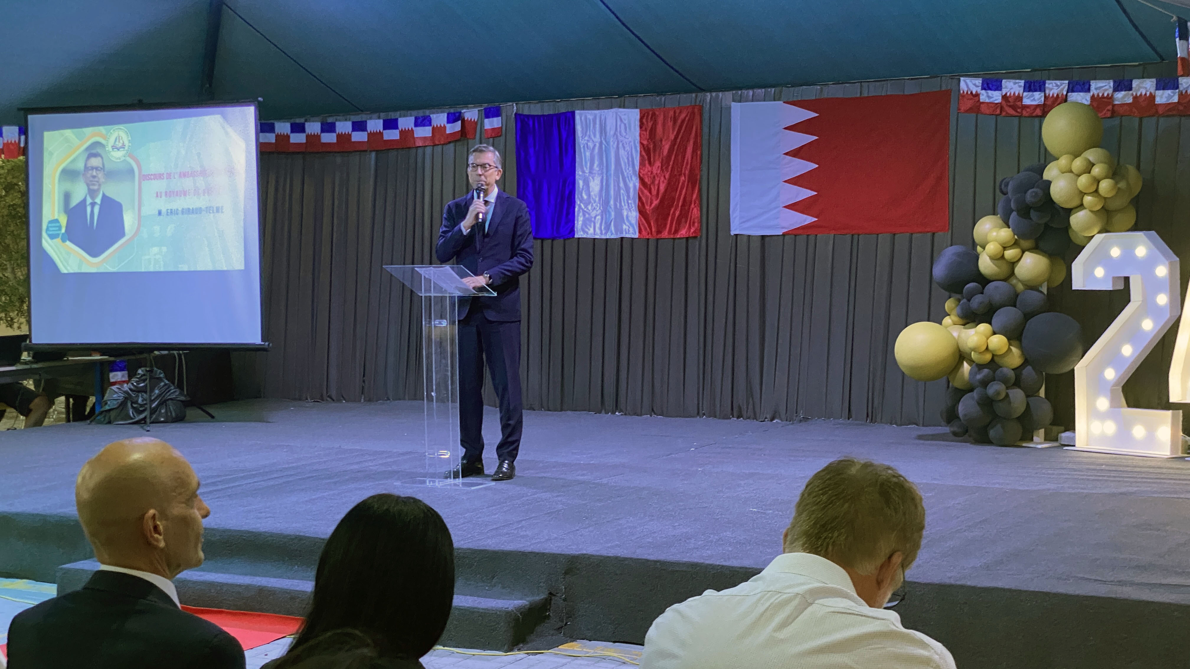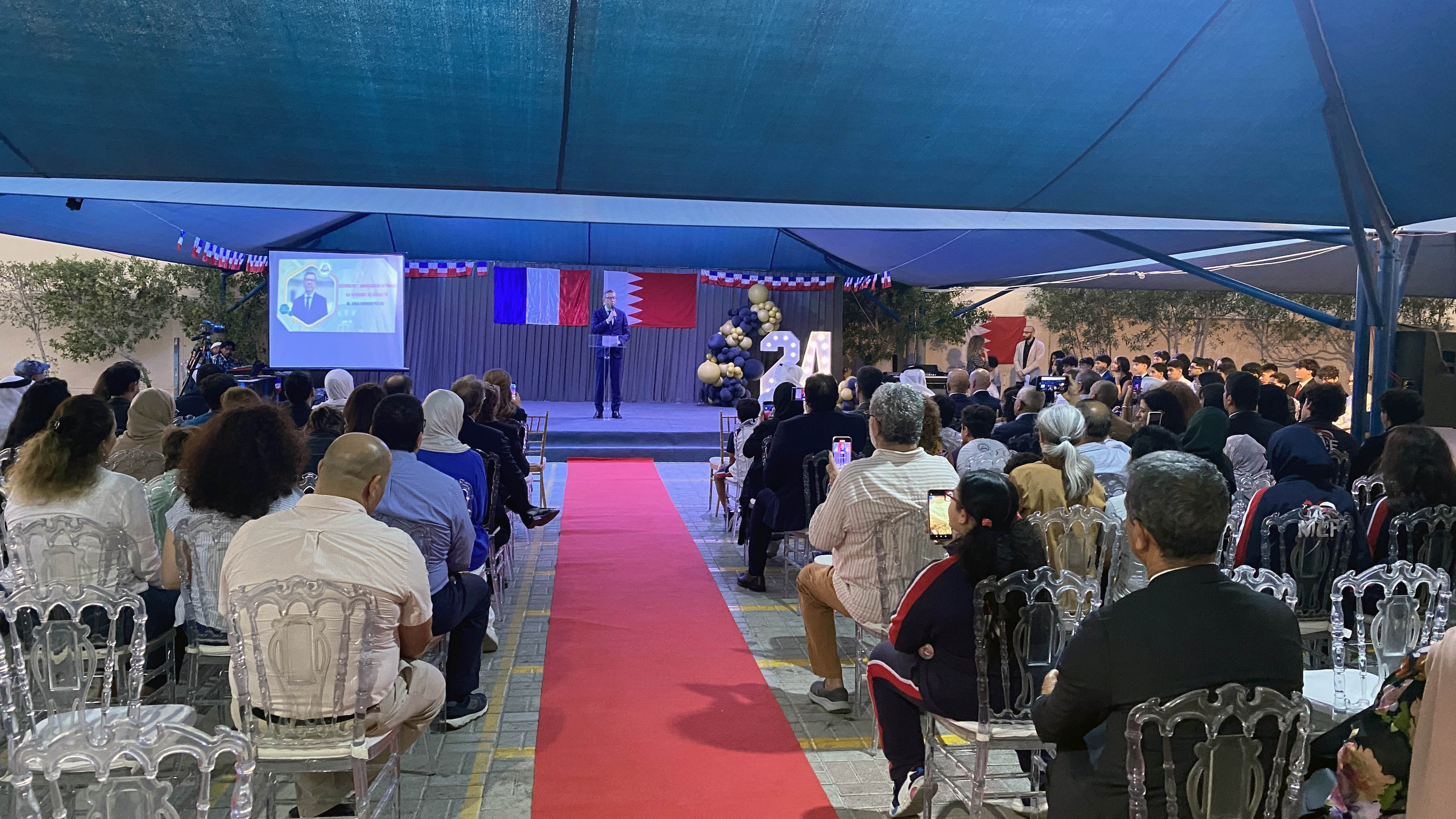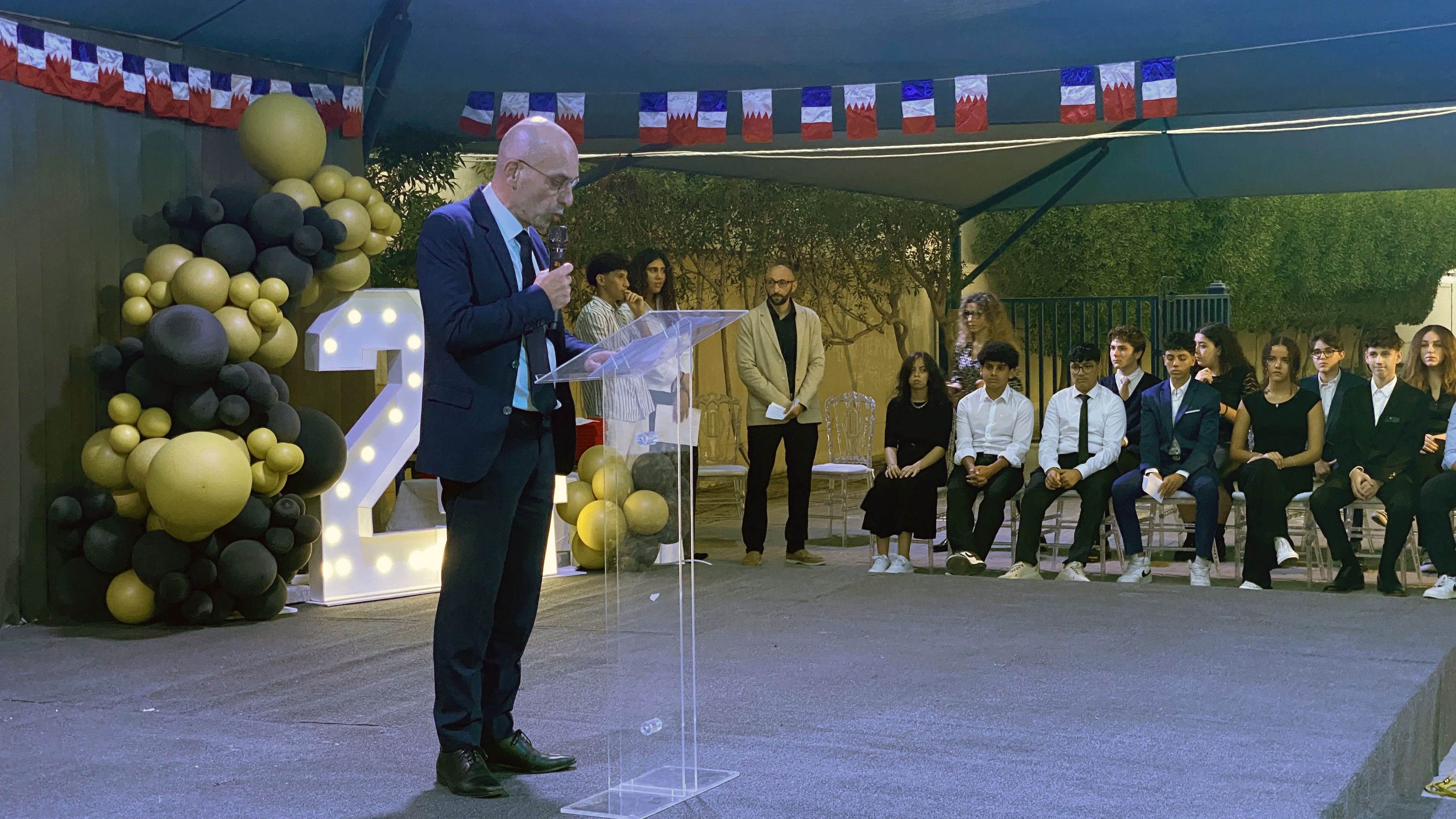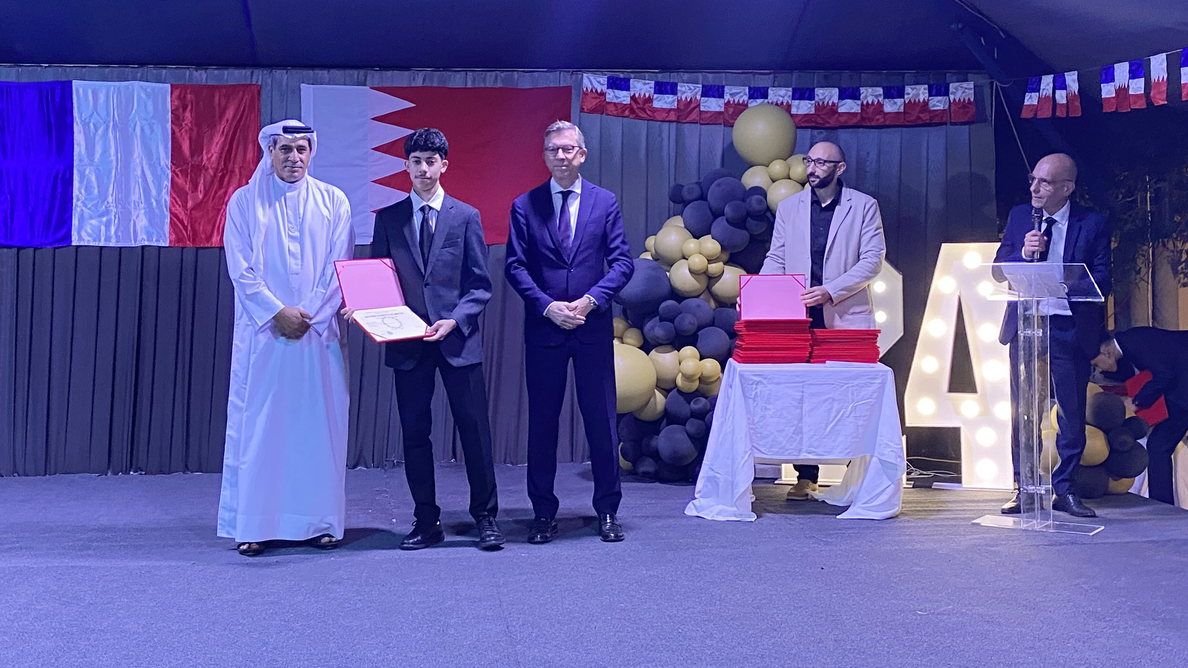 Une soirée mémorable s’est déroulée hier soir au Lycée Français International de Bahreïn. À l’occasion de la cérémonie de remise des diplômes du DNB, nous avons eu l’honneur d’accueillir Son Excellence l’ambassadeur de France à Bahreïn, M. Eric Giraud-Telme , le vice-gouverneur général, M. Jassim Mohamed Alghatam, et le directeur du département des programmes sociaux et des affaires communautaires, Ingénieur Mohammed Aljowder.