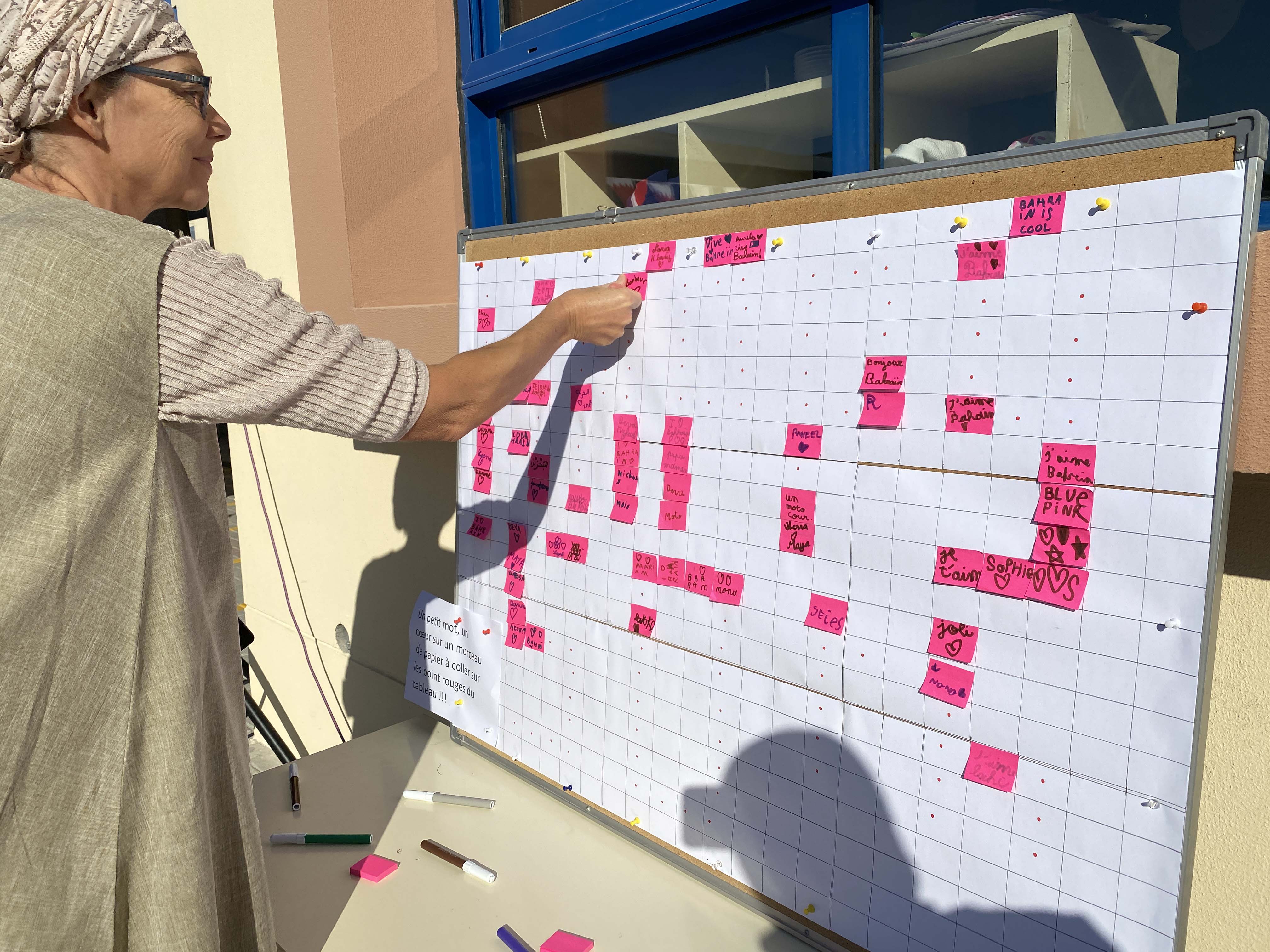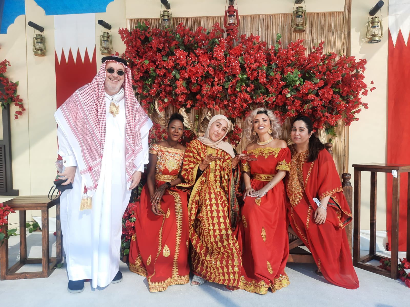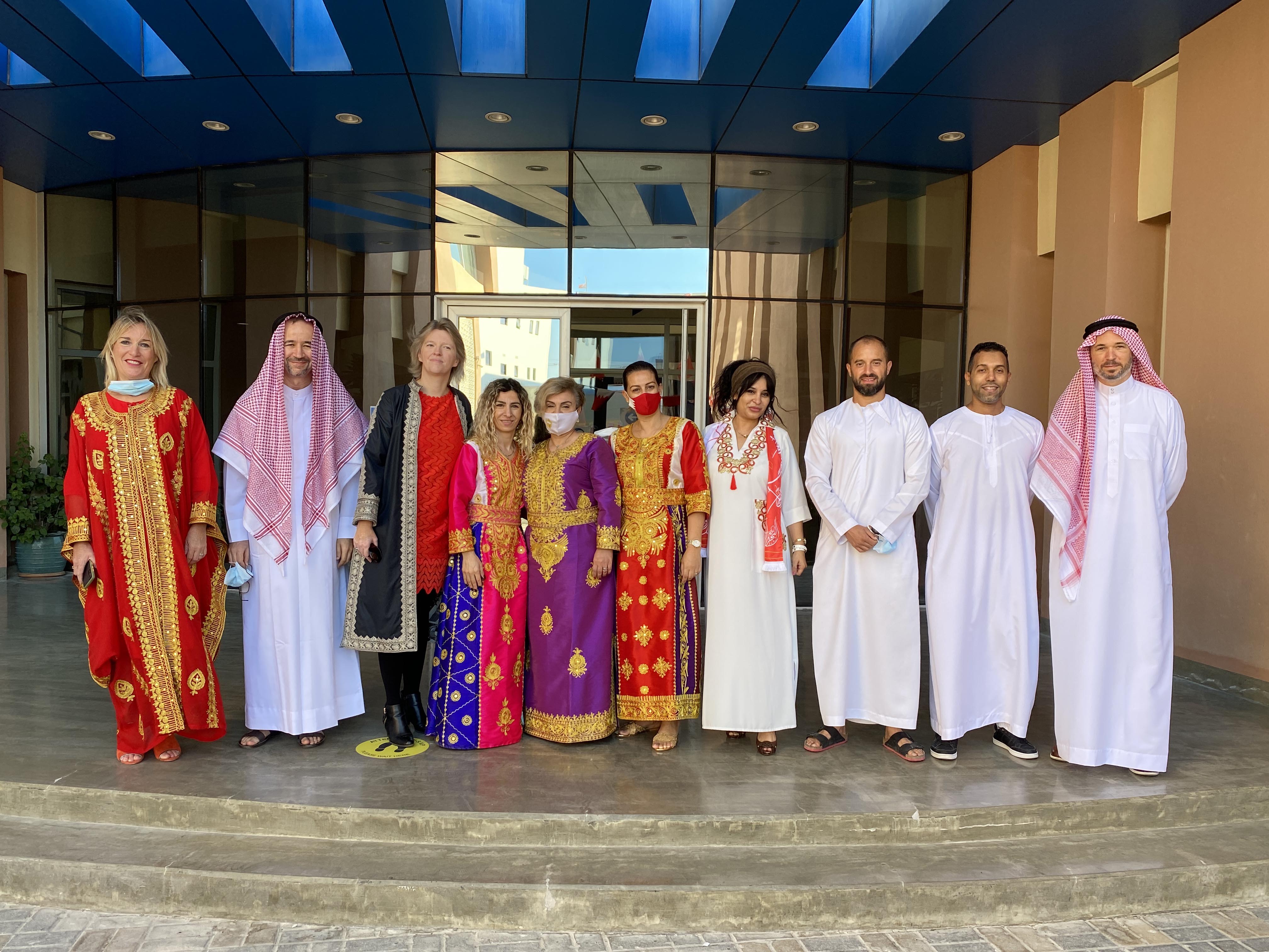 Students and staff dressed in traditional costumes or in the colours of Bahrain, exhibition of boats, weaving with palm leaves, camel, opening of pearl oysters, pottery, drawing with henna, dances, traditional games, exhibition and national anthem with flags… honour the country which welcomes us.