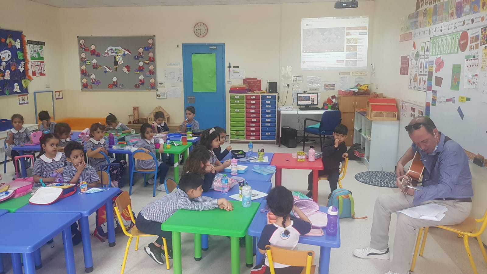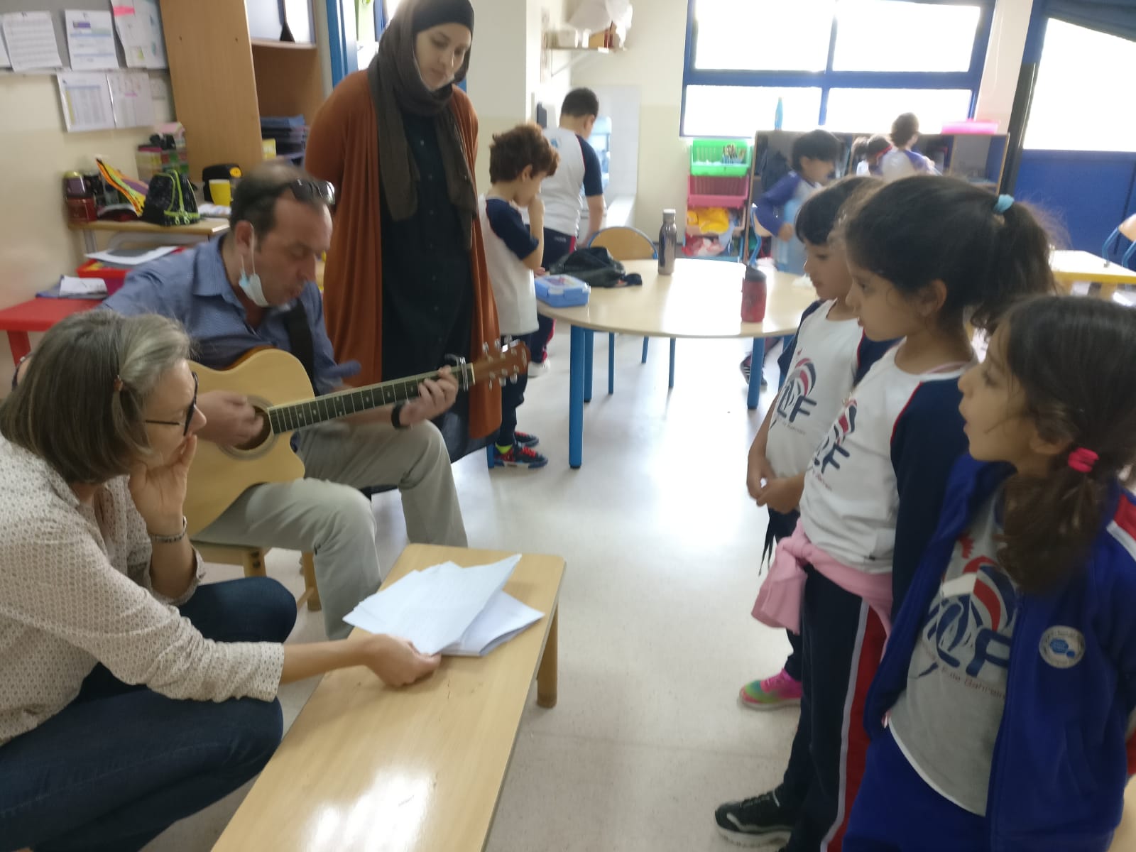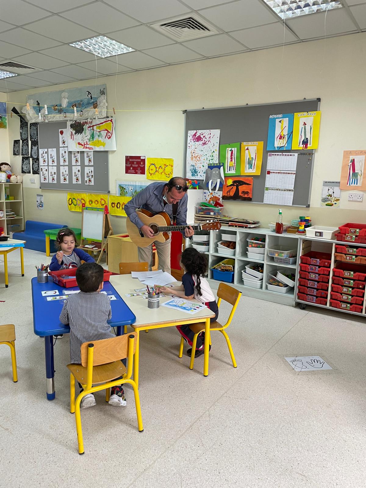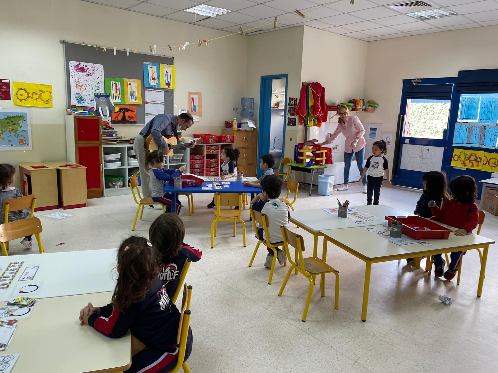 -The students of the primary school welcomed, Mr. Raphaël LEFEUVE teacher in CE2 with his guitar, in their classes singing with him French songs.