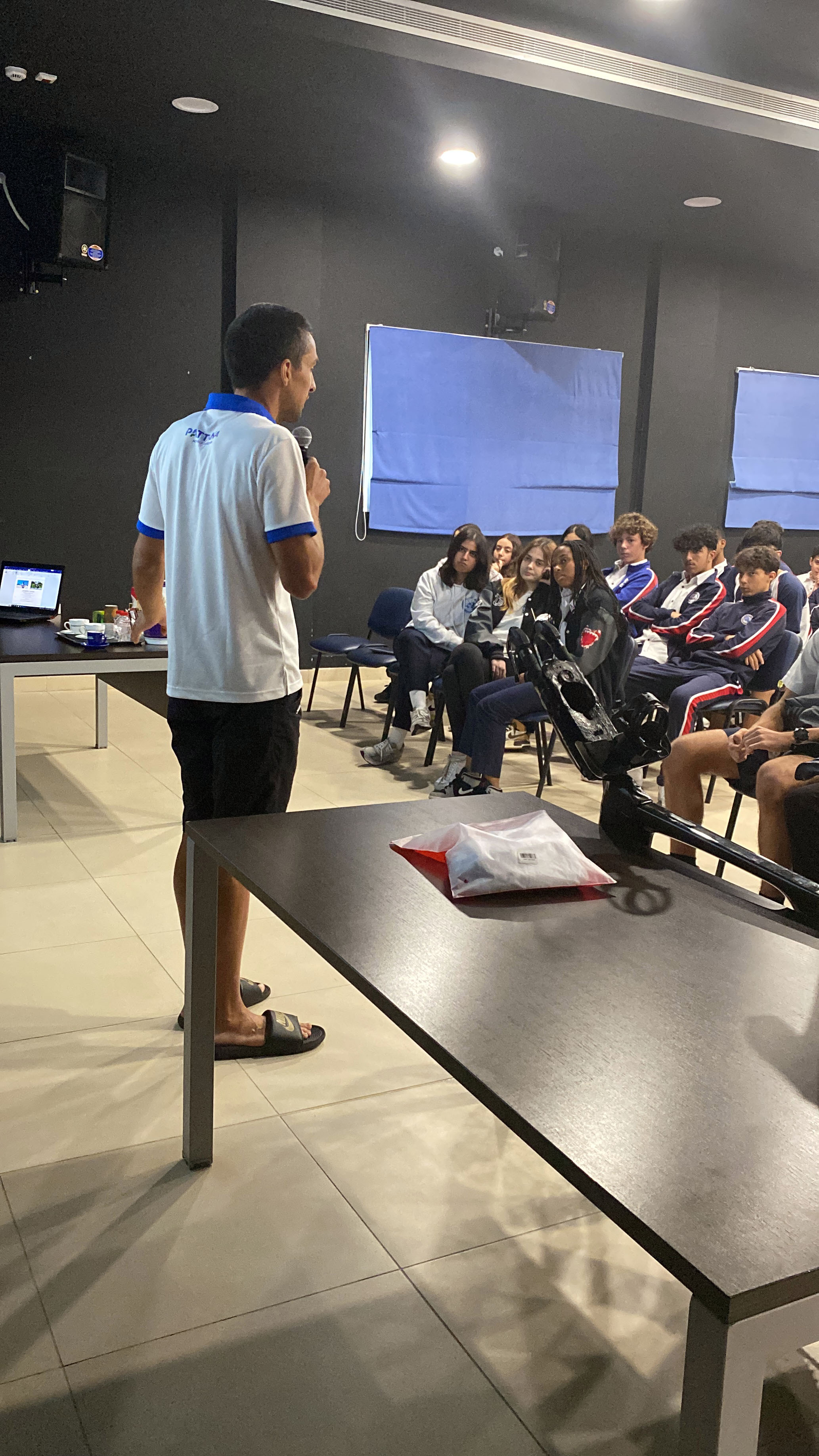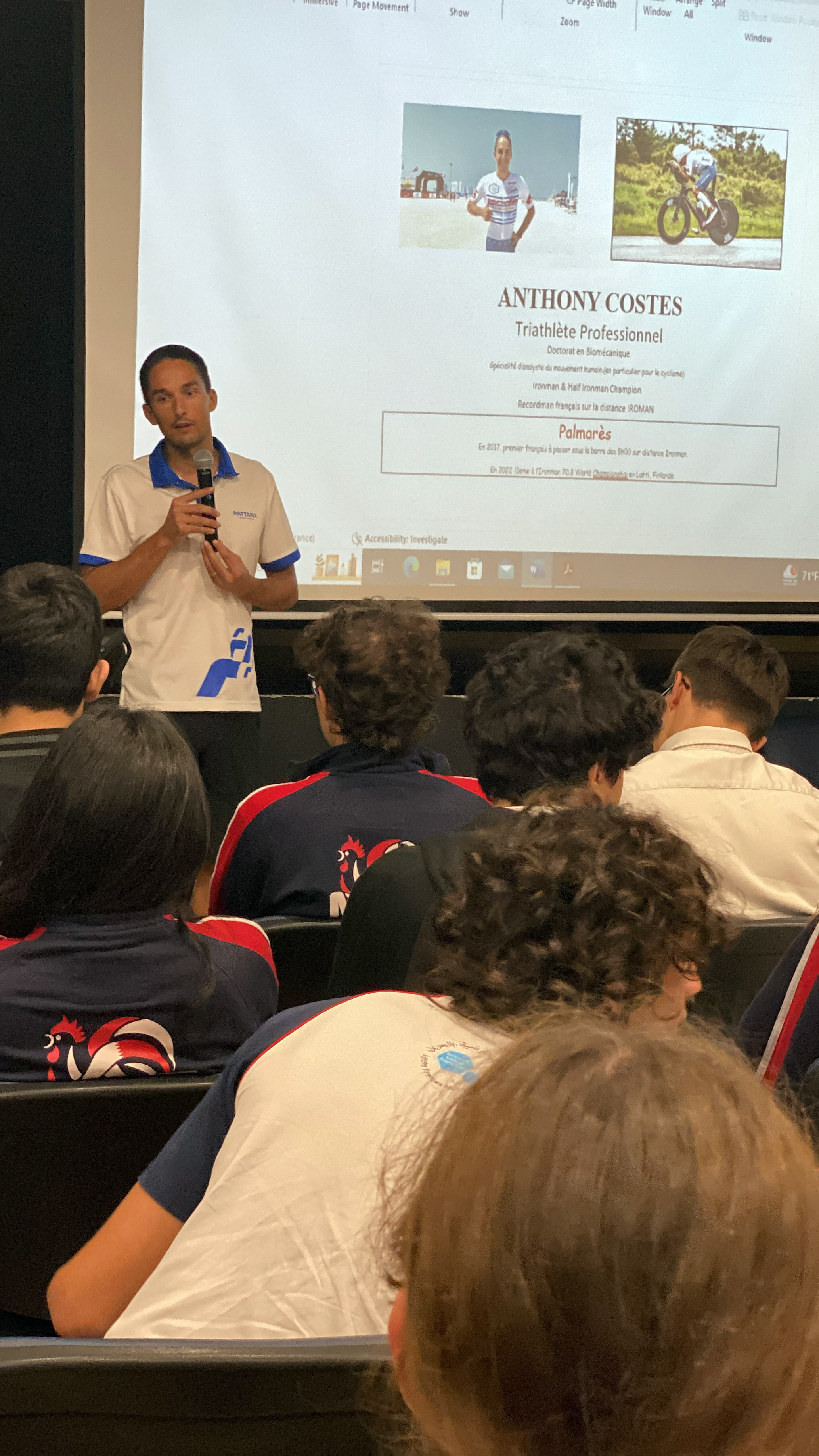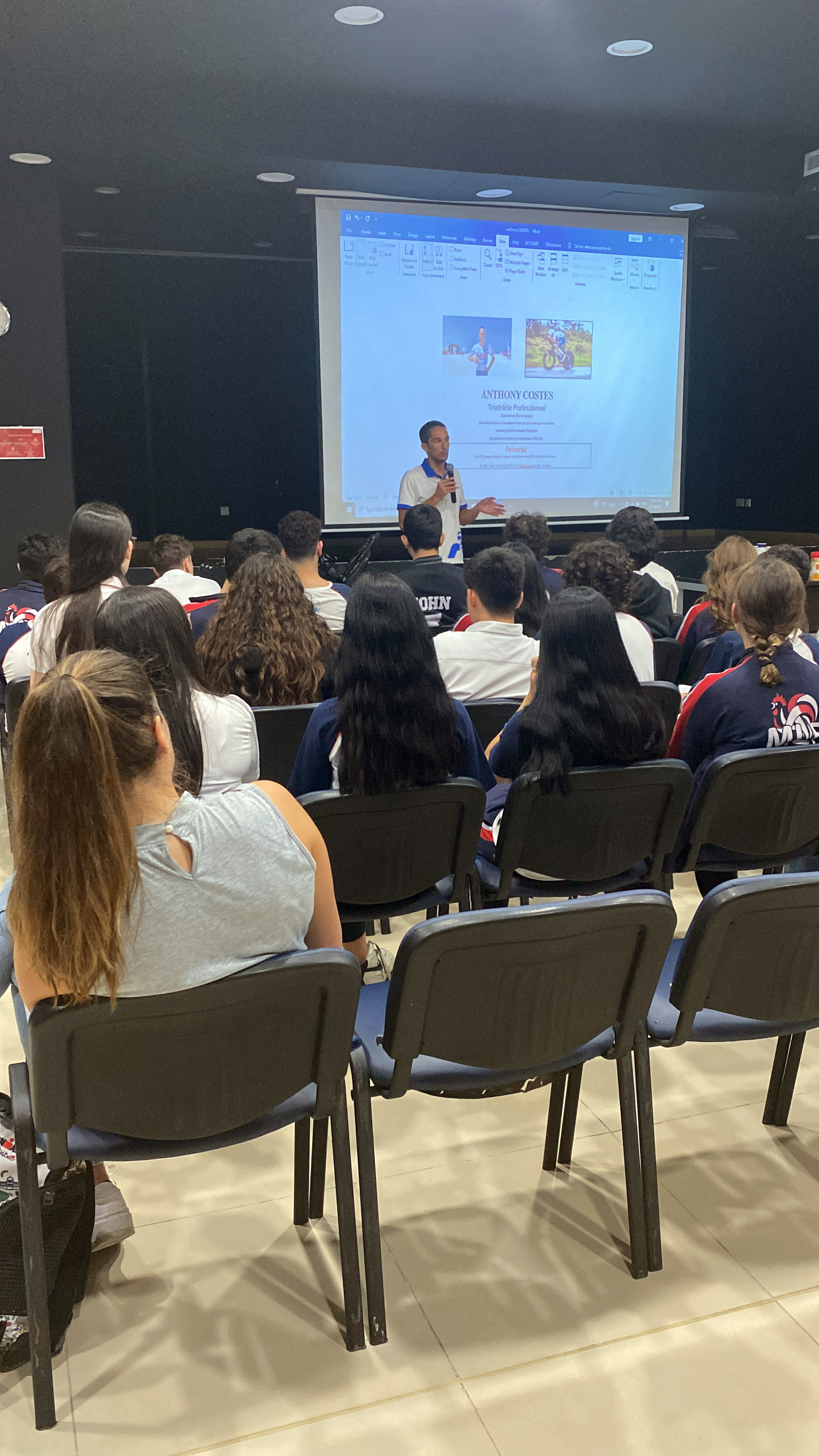 We had the pleasure of welcoming Anthony Costes, a high-level athlete, last Sunday to our establishment. First of all, he met the CE2B students as part of their project on the 2024 Olympic Games. Then, he met the students of the final year of high school, the 3rd grade, the 6 students who are candidates for the International Youth Games (IYD), as well as some high-level athletes from our school. Anthony Costes brought his bike to explain some technical points that he improved based on his knowledge acquired during his studies in biomechanics.