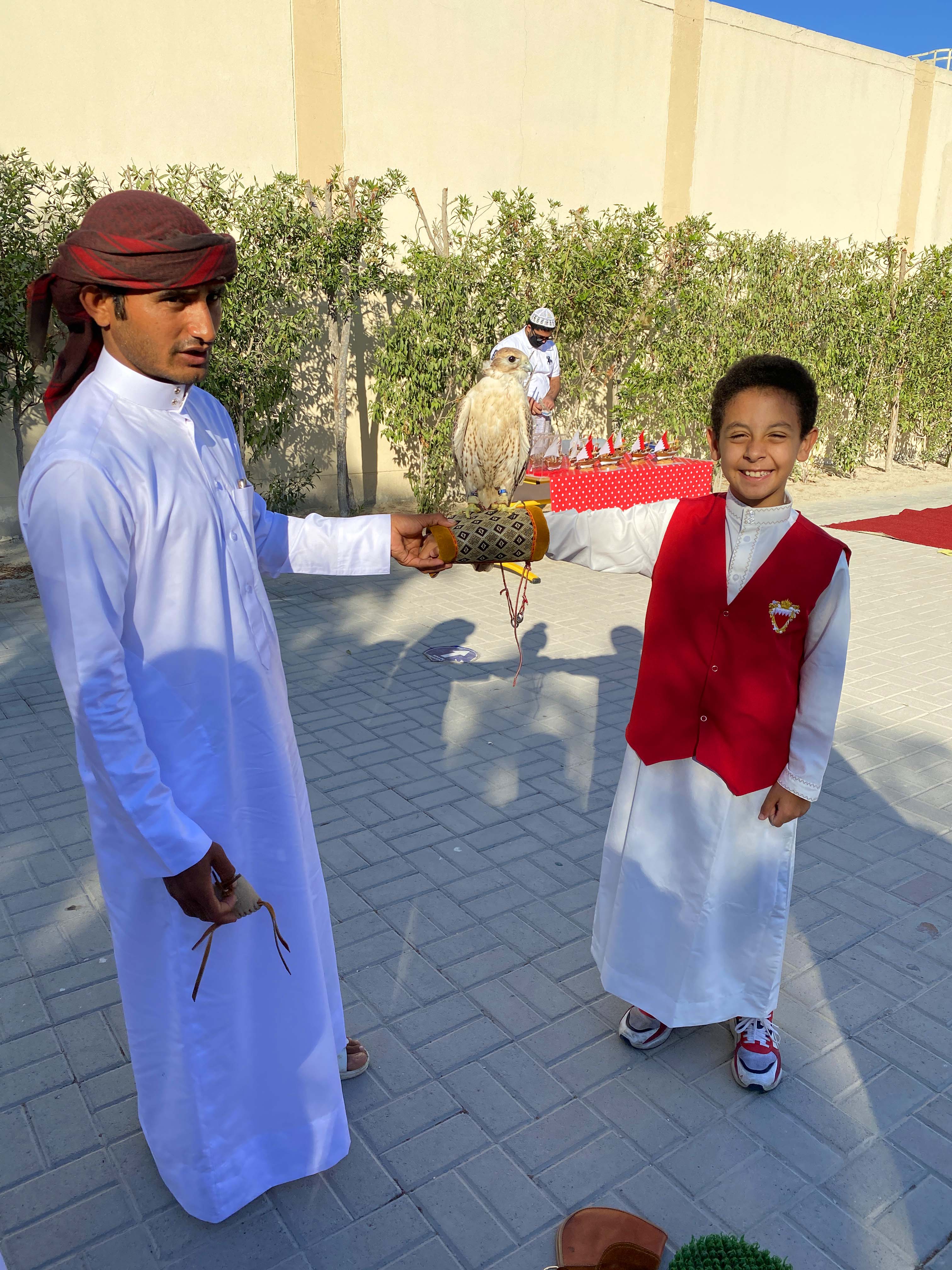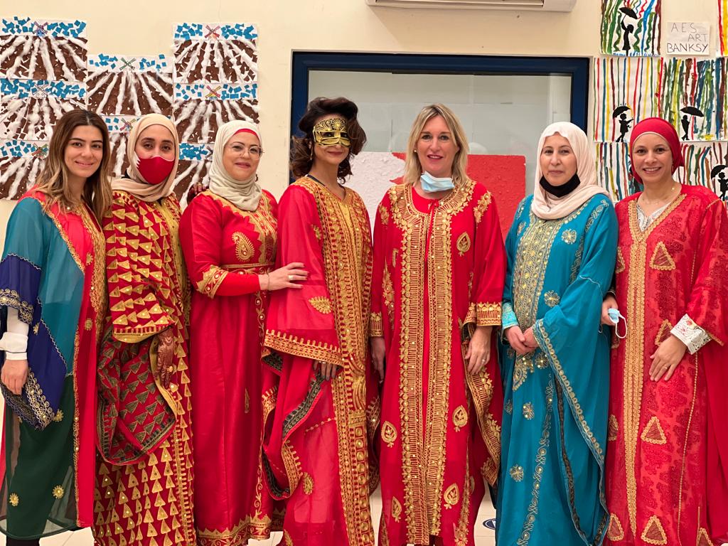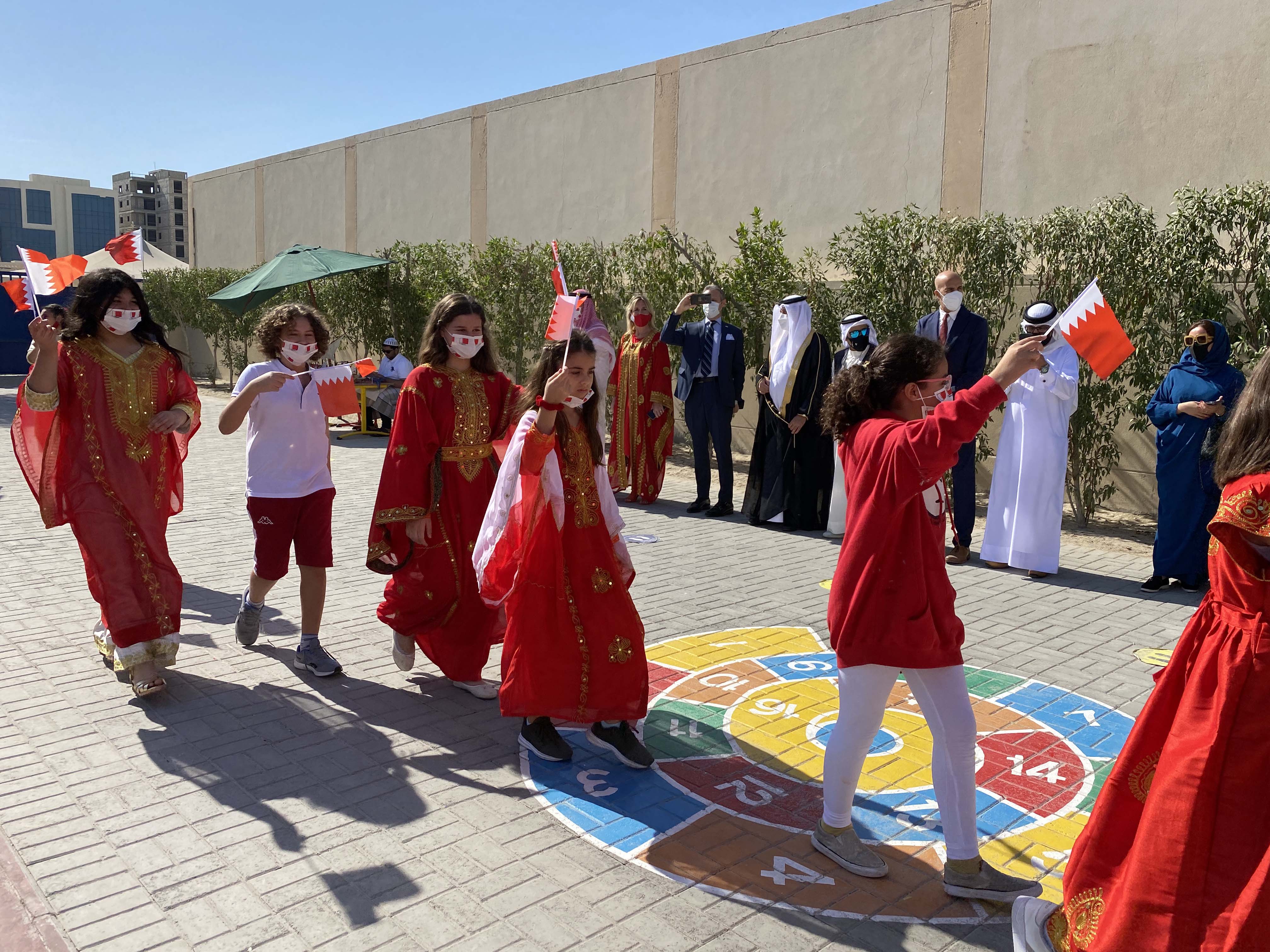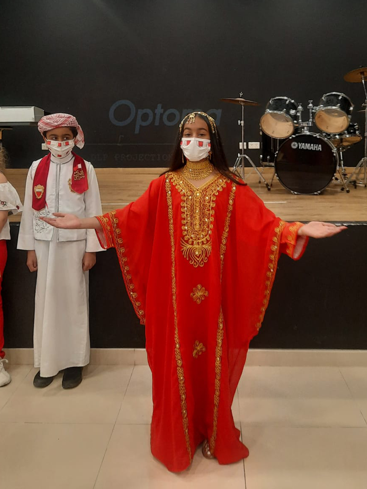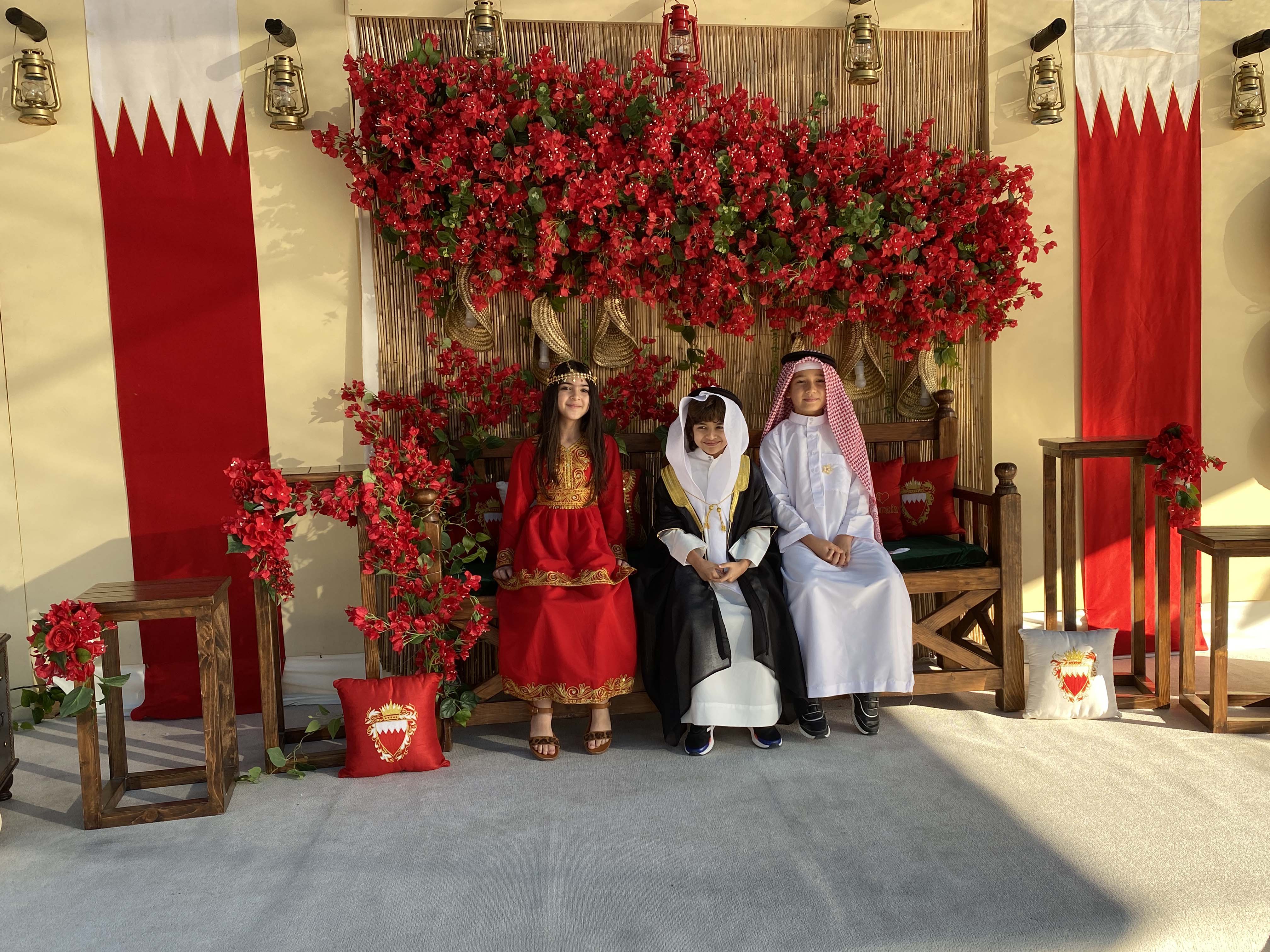 LStudents and staff dressed in traditional costumes or in the colours of Bahrain, exhibition of boats, weaving with palm leaves, camel, opening of pearl oysters, potter, drawing with henna, dances, traditional games, exhibition and national anthem with flags… Everything was gathered to honour the country which welcomes us.