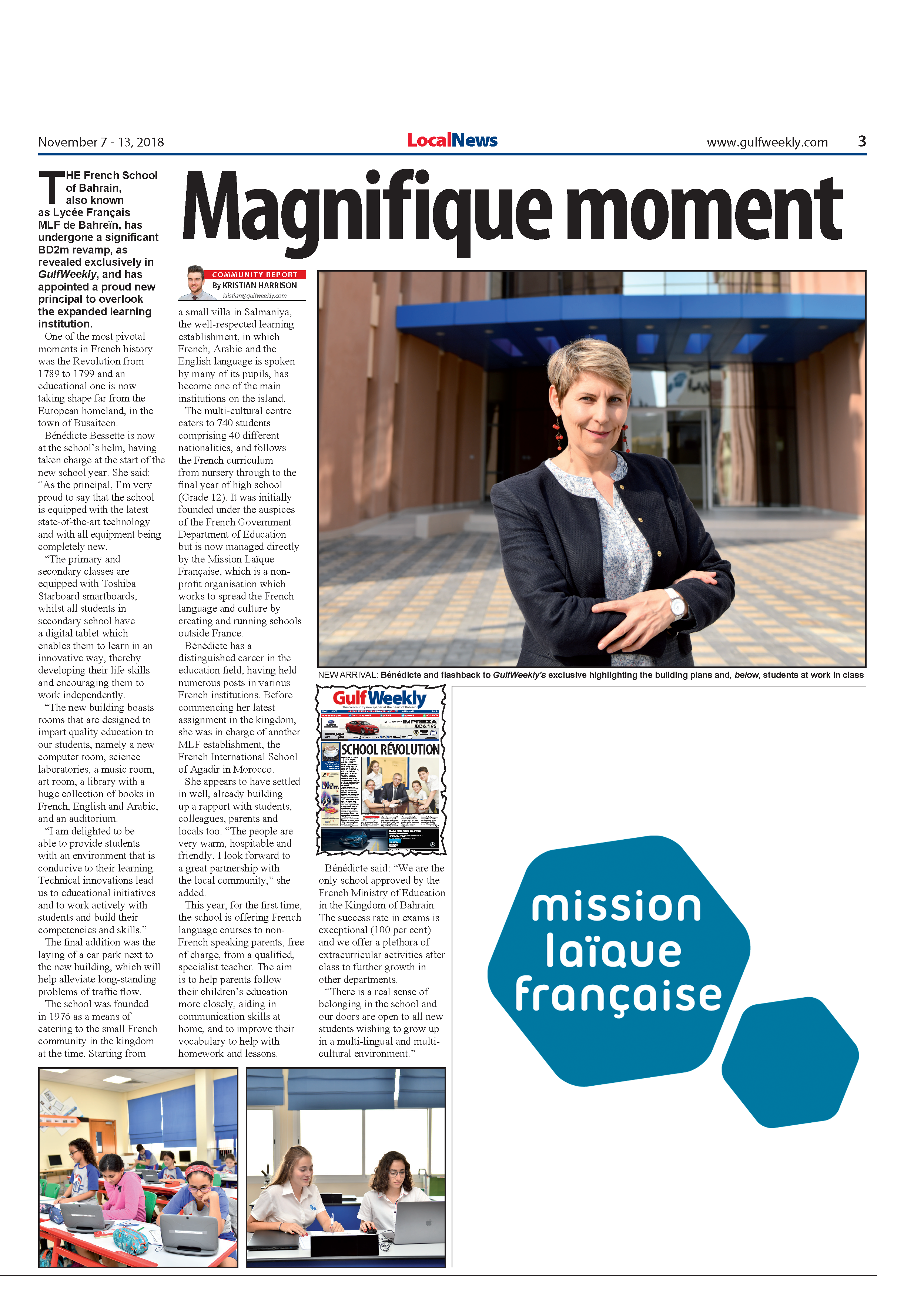 Nous souhaitons à tous nos élèves une année scolaire pleine de réussites et de succès. Nous remercions le Ministère de l’Education Bahreïni pour les efforts colossaux fournis. Le maintien d’une haute qualité d’enseignement dans le Royaume, la sécurité des élèves et du corps enseignant sont des priorités de premier rang pour le Bahreïn.